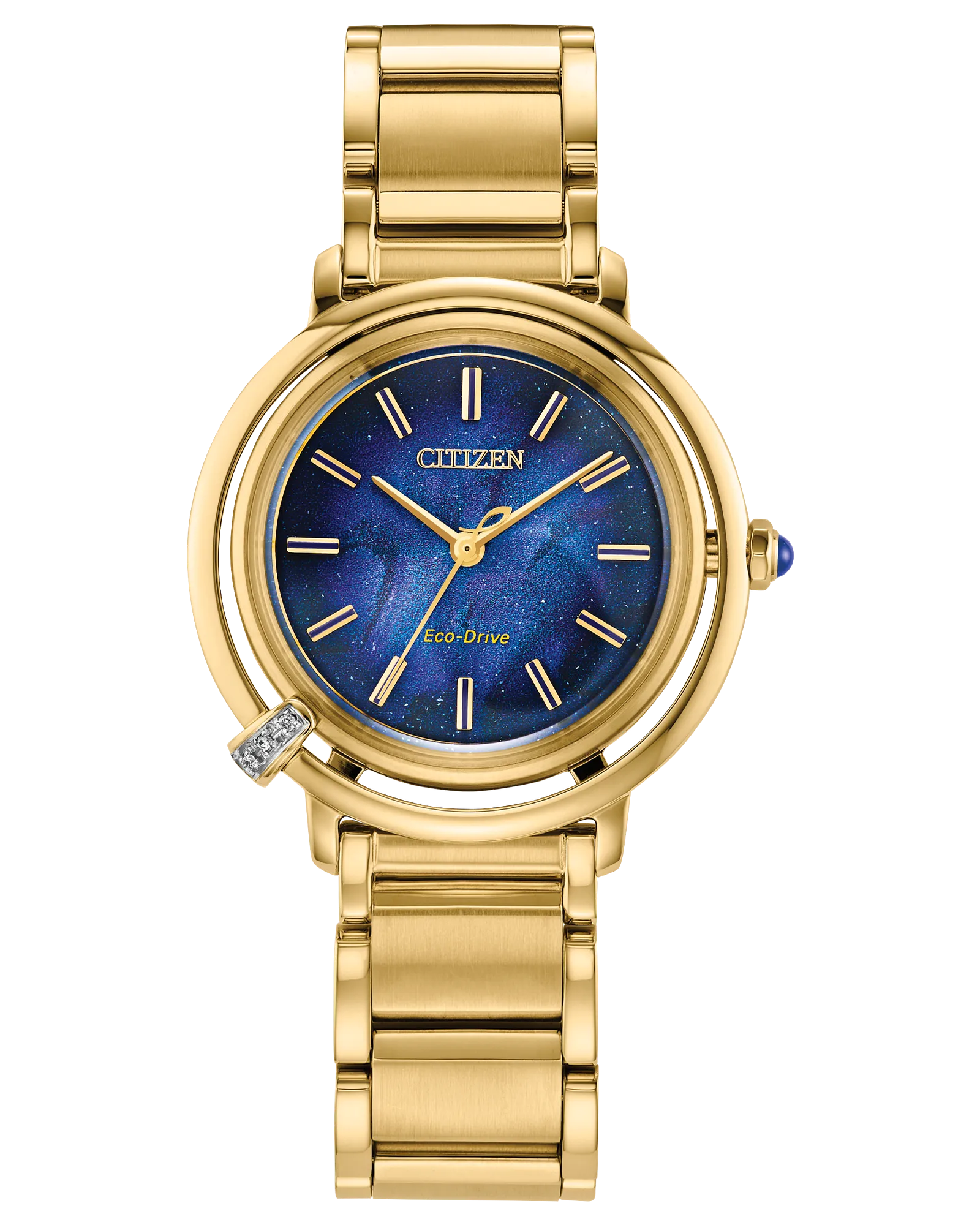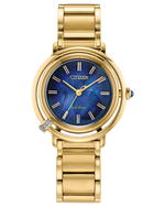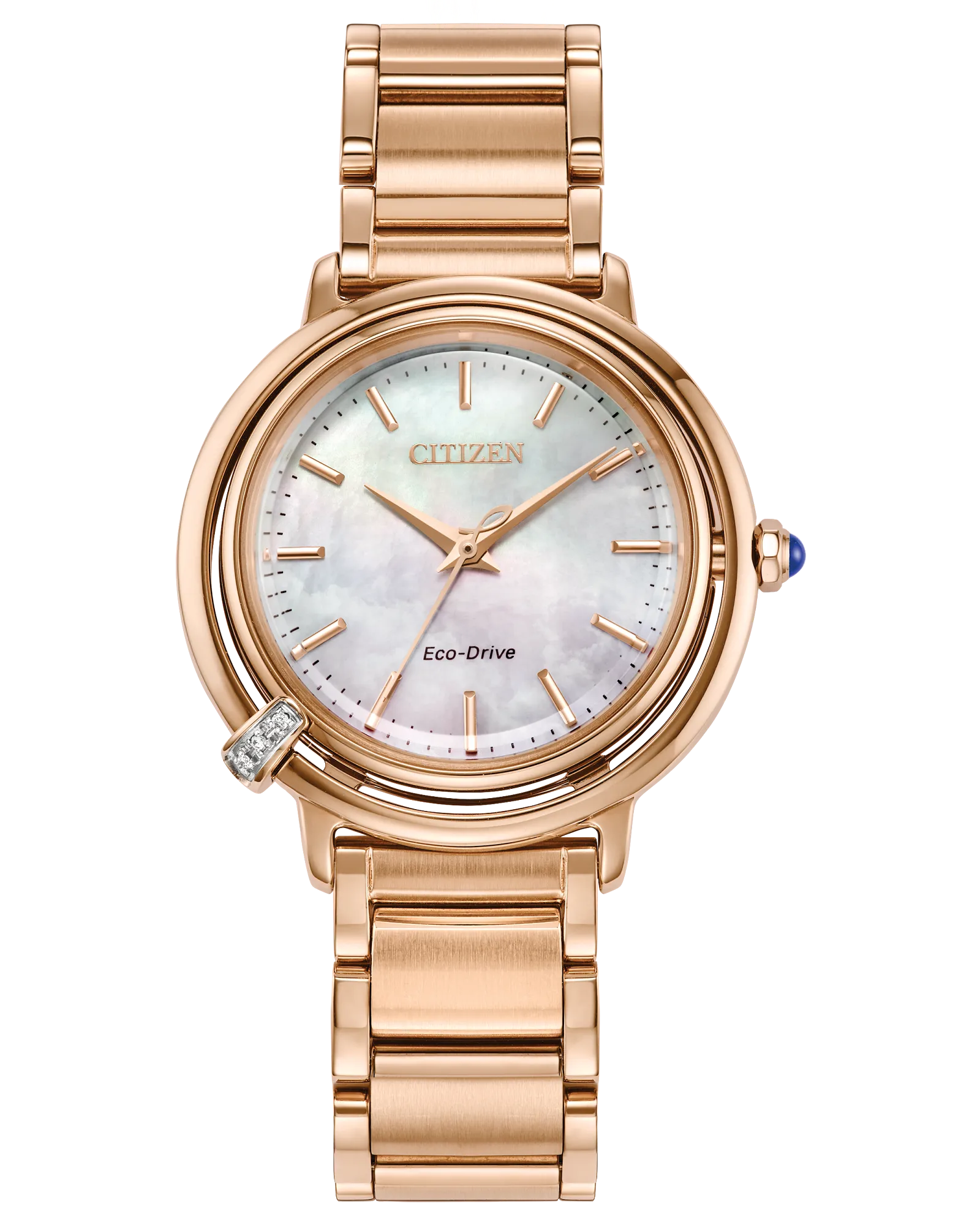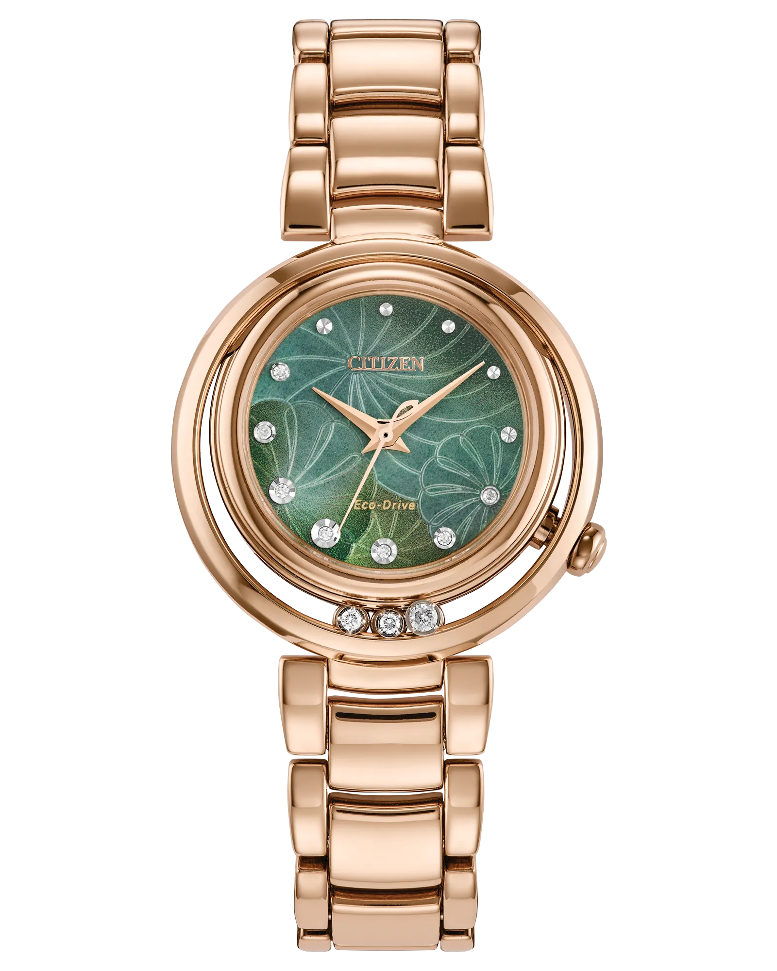 The Citizen L Arcly is an elegant women's watch that combines refinement, luxury, and environmental awareness. With its 29.8 mm circular case, rose gold-tone bezel, green mother-of-pearl dial, and three moving diamonds at 6 o'clock, it captivates with its subtle details. Powered by Eco-Drive technology, it operates using light, eliminating the need for battery changes. It's a timepiece that can be worn both day and night.