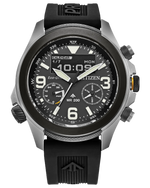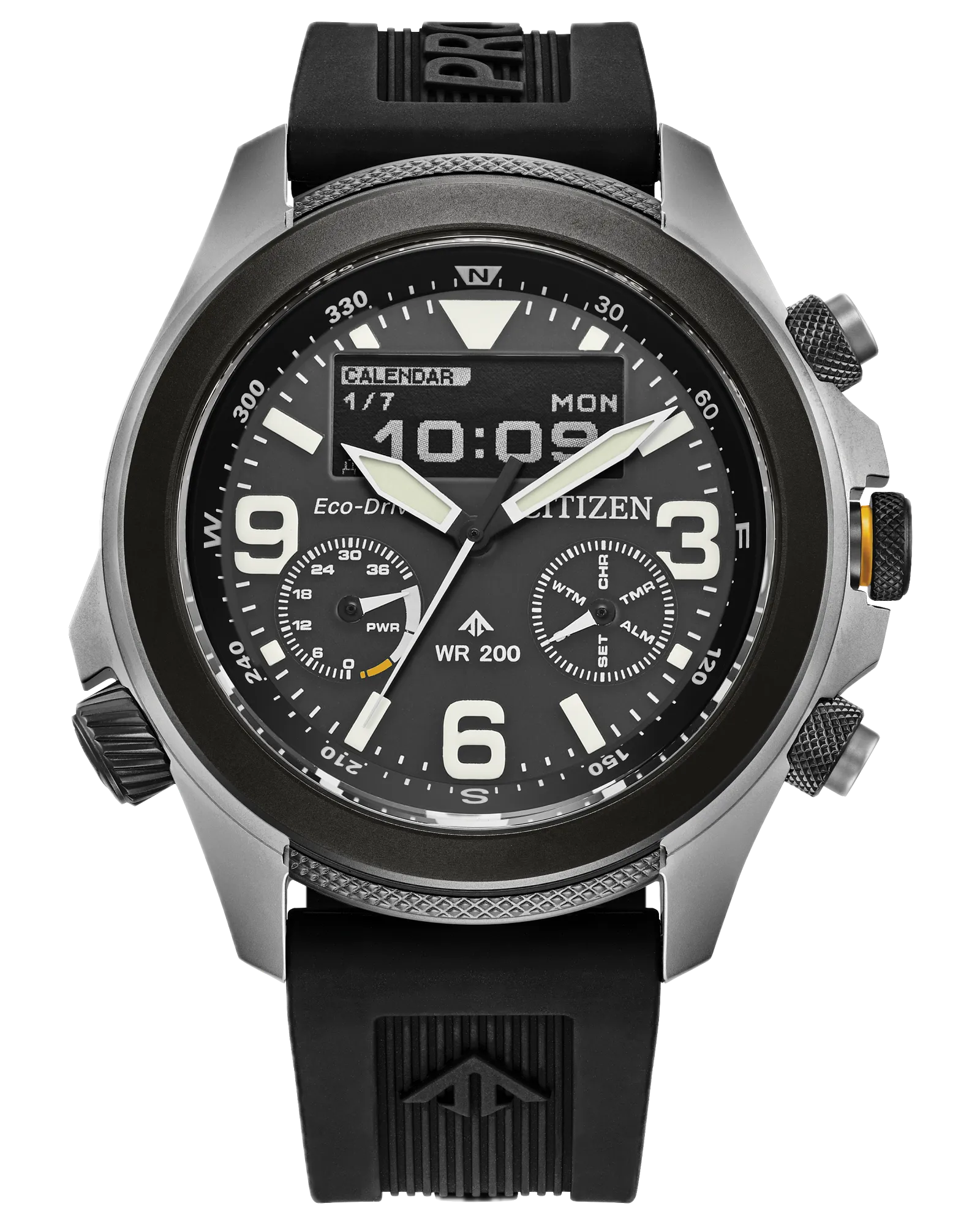 The Promaster Land U822 is an ultra-complete field watch, combining analog and digital (ana-digi) displays with the Eco-Drive U822 caliber. Its robust design, numerous functions (chronograph, world time, alarm, perpetual calendar, light level indicator), and 200m water resistance make it an adventure watch ready for everyday wear. Its 43.9mm case, rotating compass bezel, and high-visibility MIP display make this watch as practical as it is assertive.