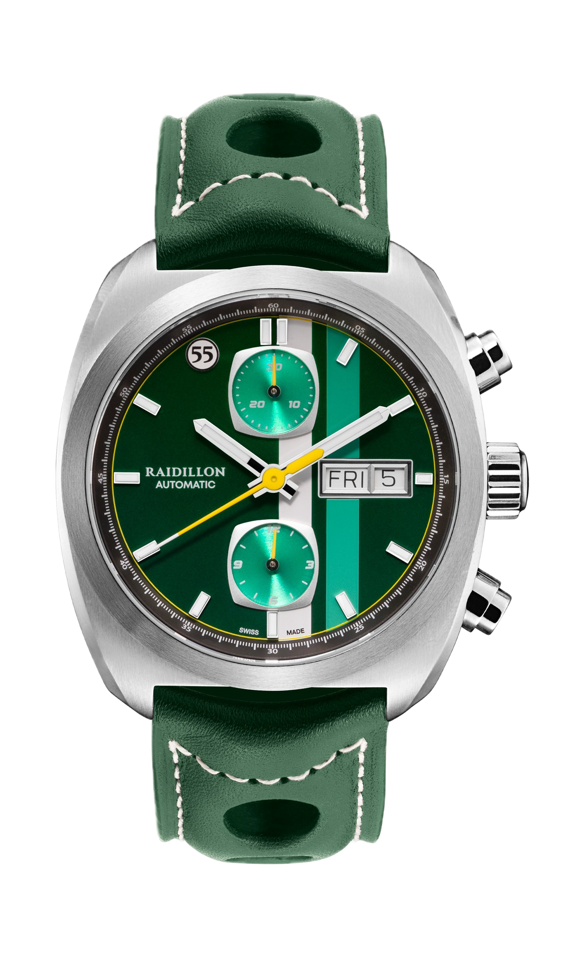 Powered by Swiss automatic movements, the collection combines reliability and watchmaking expertise. The anti-reflective sapphire crystal ensures perfect readability, while water resistance to 10 ATM makes these watches suitable for everyday wear. Leather straps, available in understated styles or with racing accents, complete an elegant and versatile aesthetic.