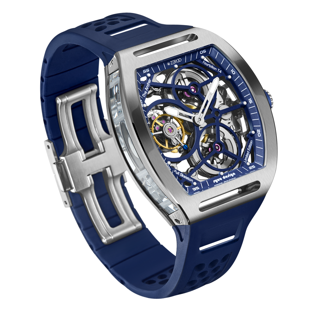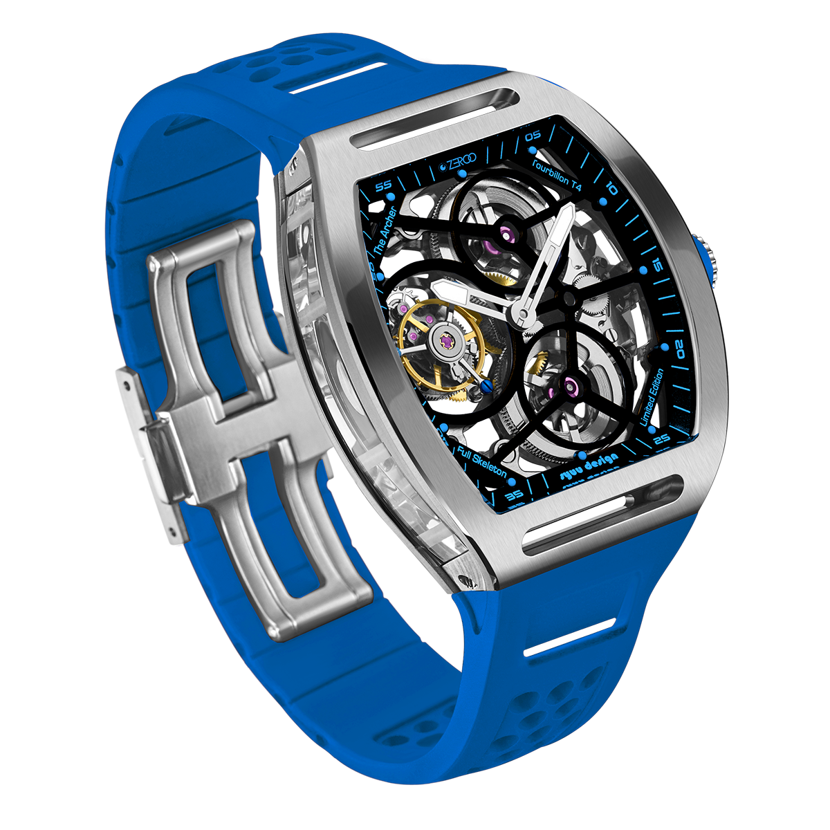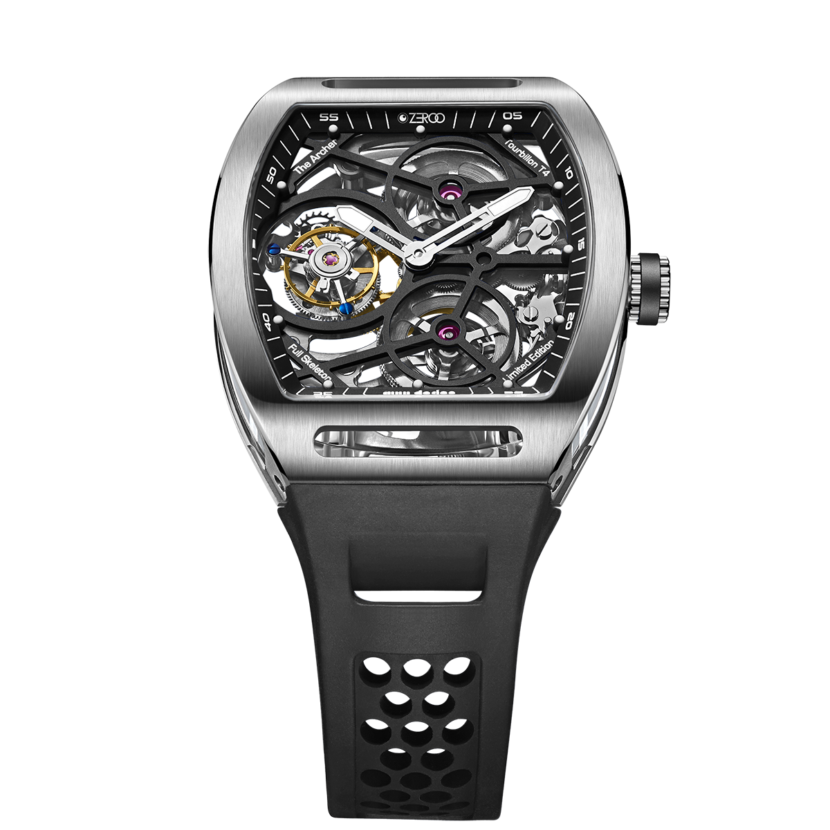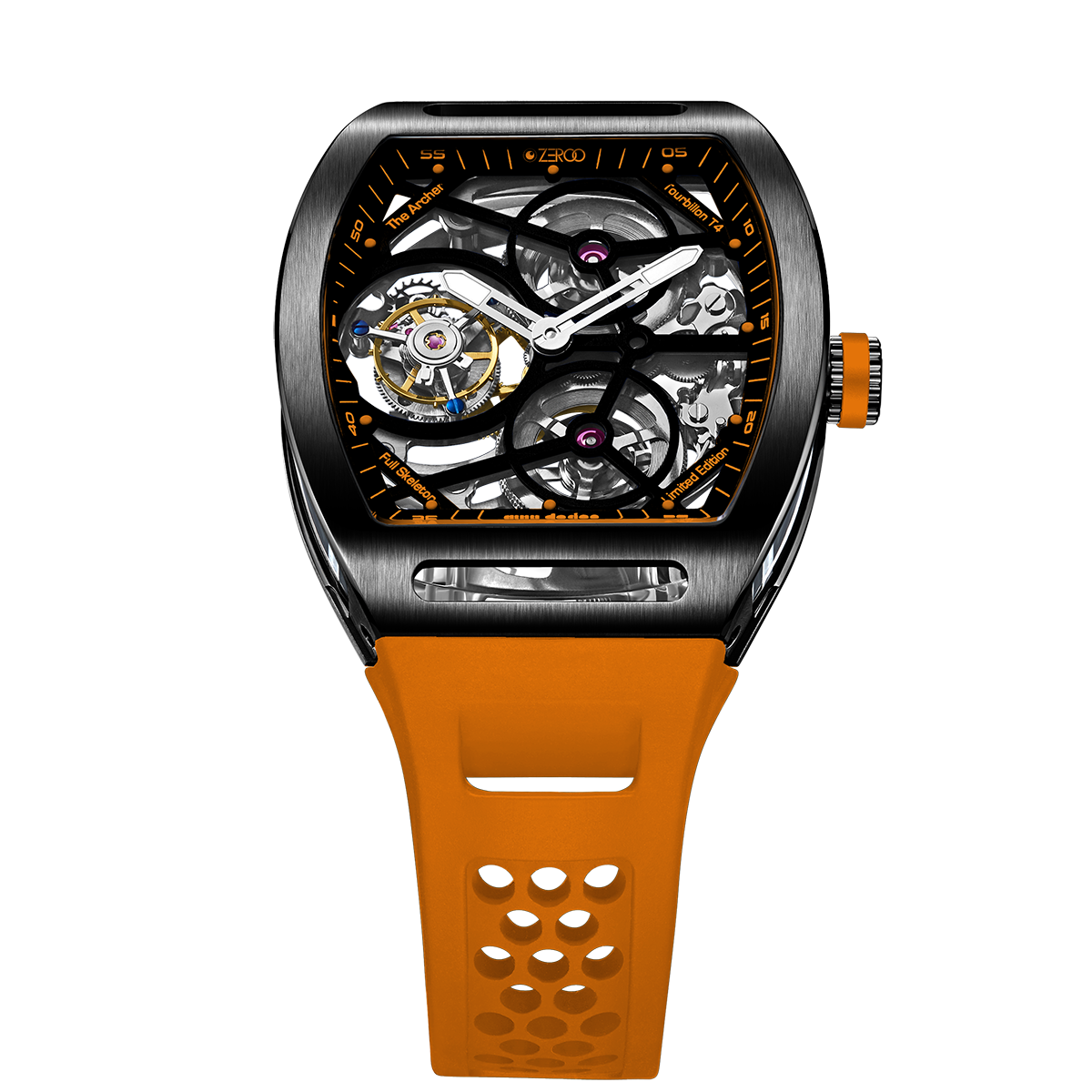 The ZEROO T4-01 watch stands out for its bold design and precision mechanics. It features a fully skeletonized dial, offering a detailed view of the inner workings. The tourbillon, a central element, ensures increased precision by countering the effects of gravity. Its aesthetic is modern, combining watchmaking tradition and innovation. Ideal for lovers of sophisticated mechanical watches, it combines functionality and style.