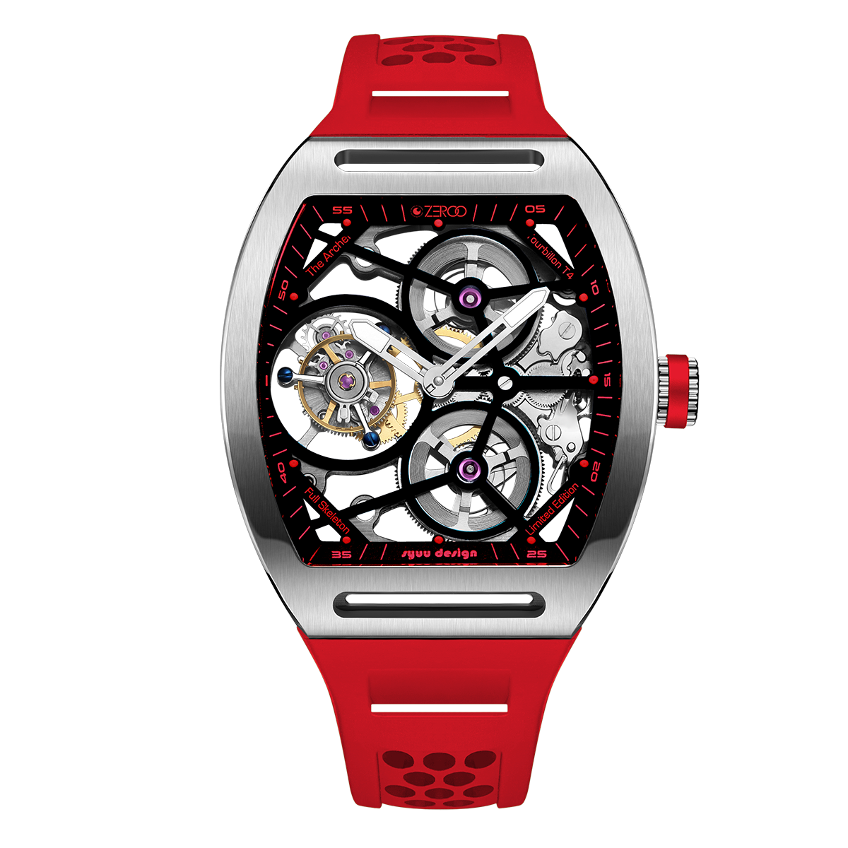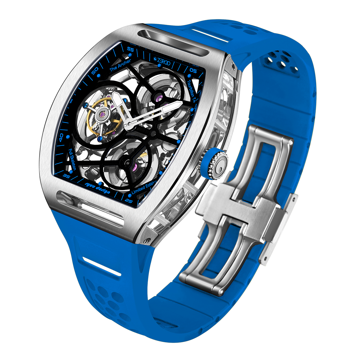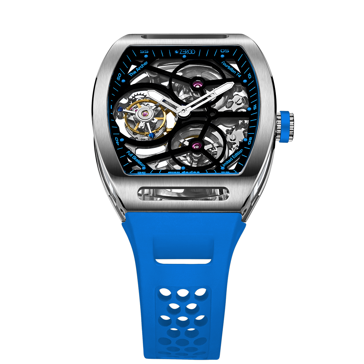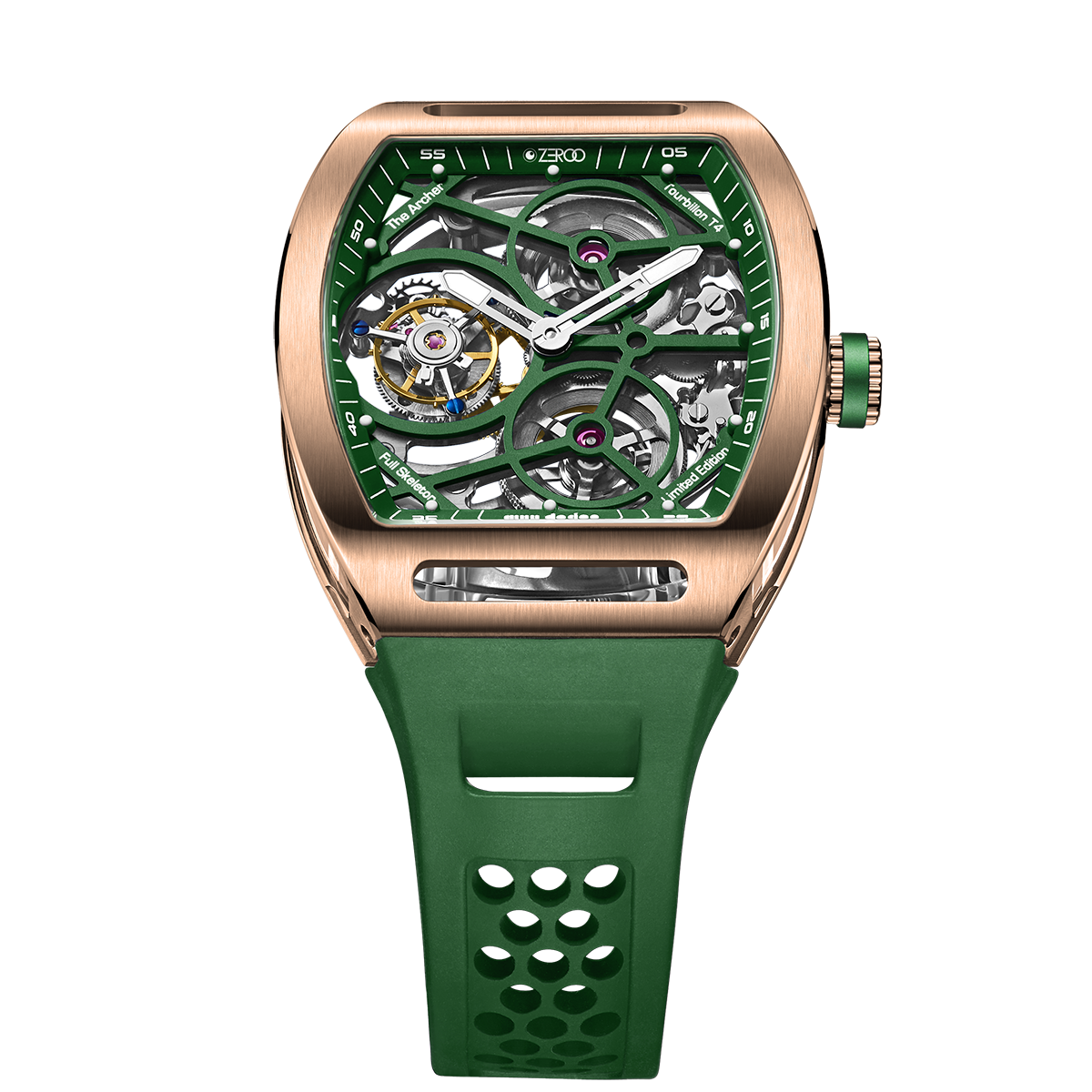 The ZEROO T4-01 watch stands out for its bold design and precision mechanics. It features a fully skeletonized dial, offering a detailed view of the inner workings. The tourbillon, a central element, ensures increased precision by countering the effects of gravity. Its aesthetic is modern, combining watchmaking tradition and innovation. Ideal for lovers of sophisticated mechanical watches, it combines functionality and style.