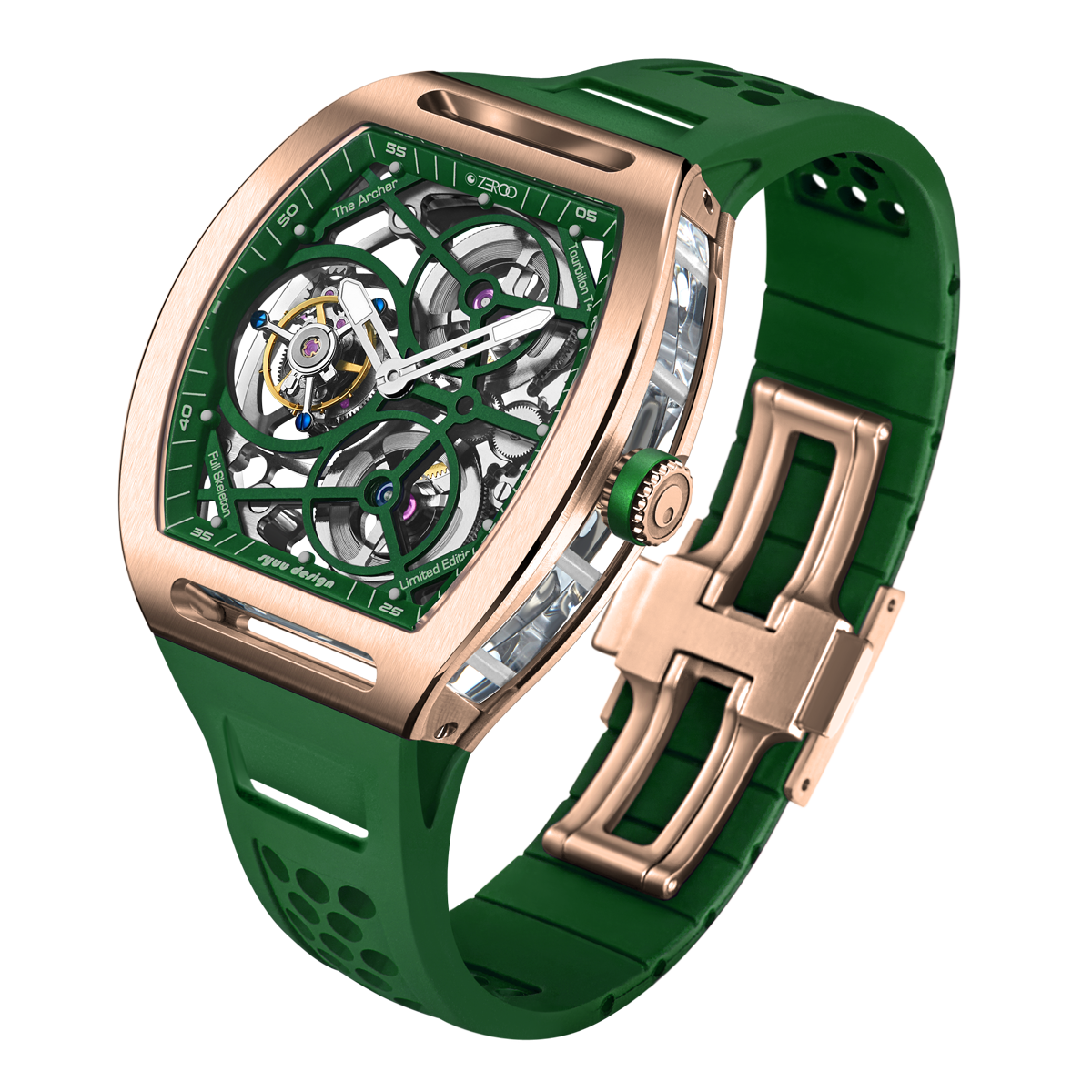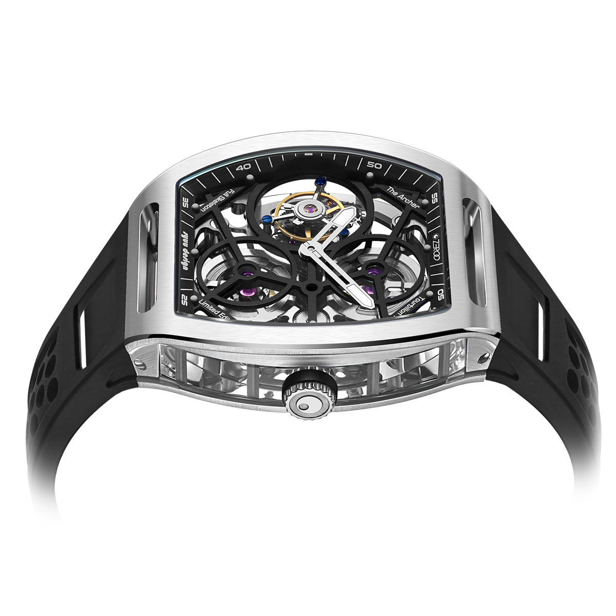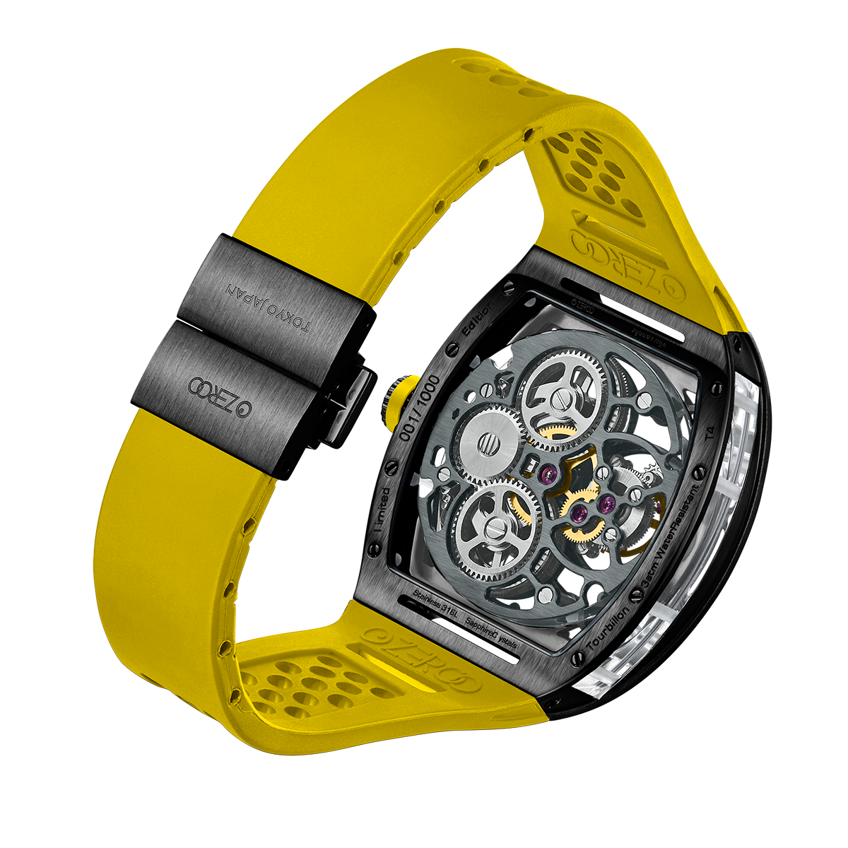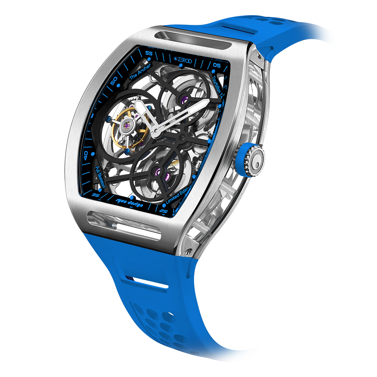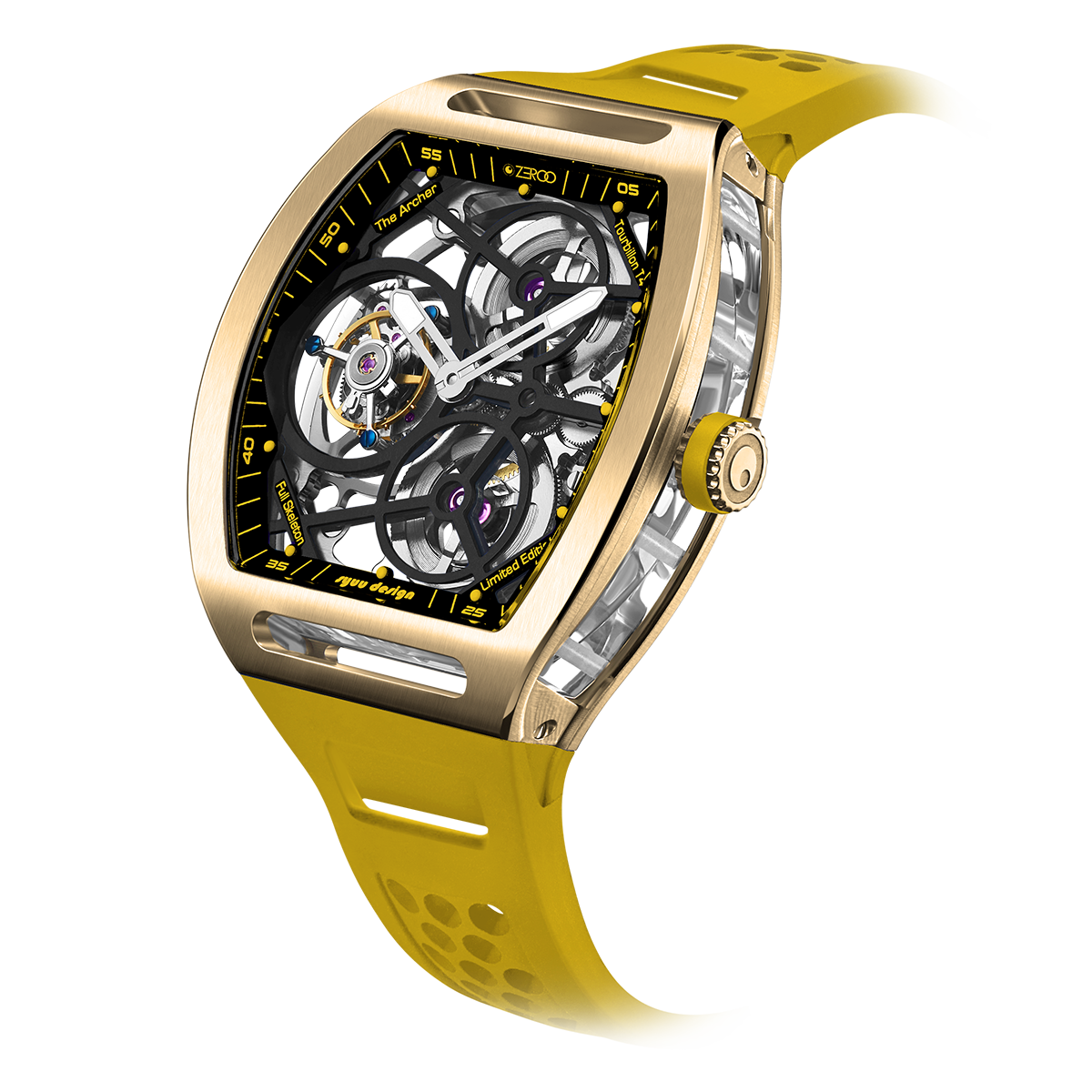 The ZEROO T4-01 watch stands out for its bold design and precision mechanics. It features a fully skeletonized dial, offering a detailed view of the inner workings. The tourbillon, a central element, ensures increased precision by countering the effects of gravity. Its aesthetic is modern, combining watchmaking tradition and innovation. Ideal for lovers of sophisticated mechanical watches, it combines functionality and style.