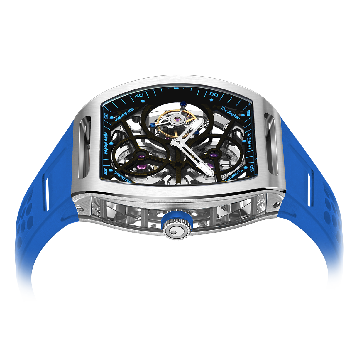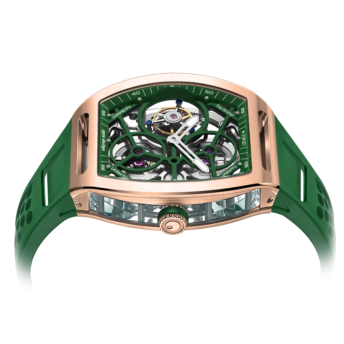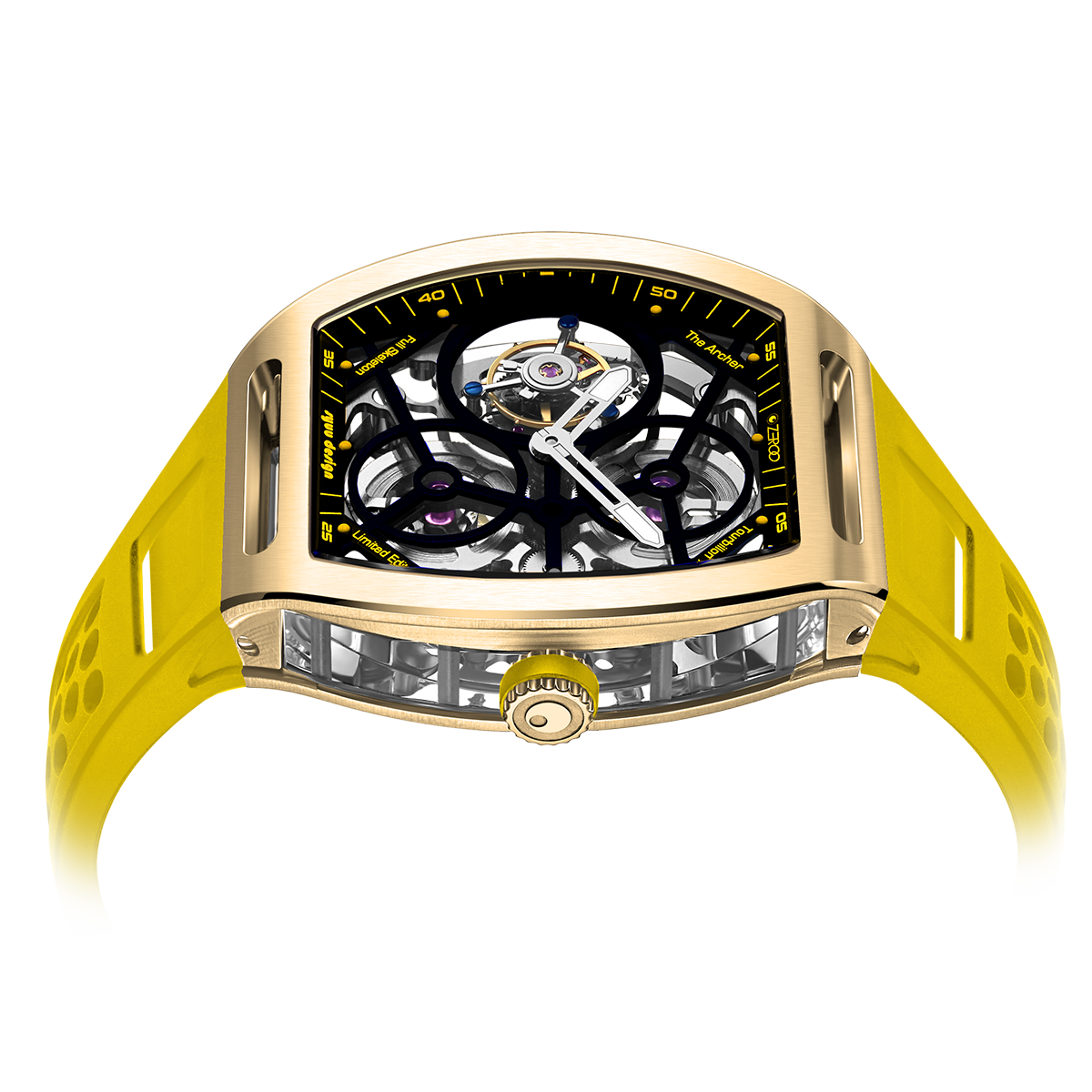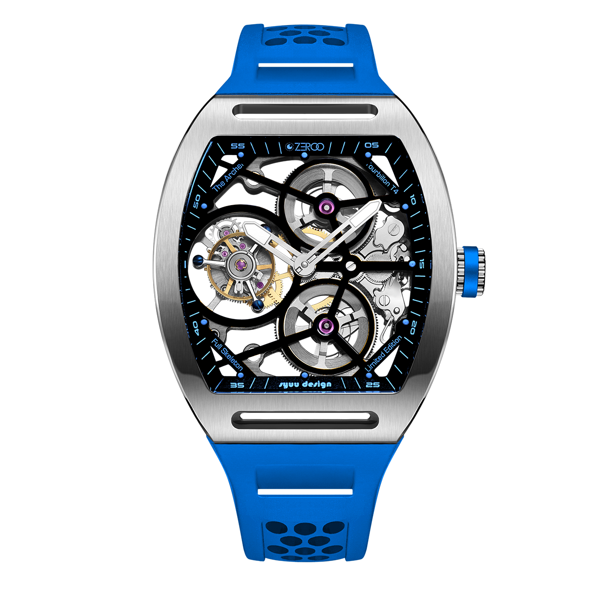 The ZEROO T4-01 watch stands out for its bold design and precision mechanics. It features a fully skeletonized dial, offering a detailed view of the inner workings. The tourbillon, a central element, ensures increased precision by countering the effects of gravity. Its aesthetic is modern, combining watchmaking tradition and innovation. Ideal for lovers of sophisticated mechanical watches, it combines functionality and style.