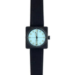 The VinylPilot features a 36mm x 36mm square case in black PVD-coated stainless steel. Inspired by the rugged aesthetic of vintage cockpit instruments, the top and bezel have been completely redesigned based on the original Vinyl Record case. The bezel is secured by four exposed screws for an industrial, utilitarian look, proportioned to fit any wrist without compromise.