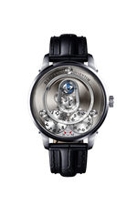 The hours and minutes are displayed by two off-center metal discs, positioned at 7:00 and 5:00, while a double-pointed hand indicates the seconds in the center of the dial. The sky-blue background of the dial evokes the immensity of space, adding an aesthetic touch to this exceptional piece.