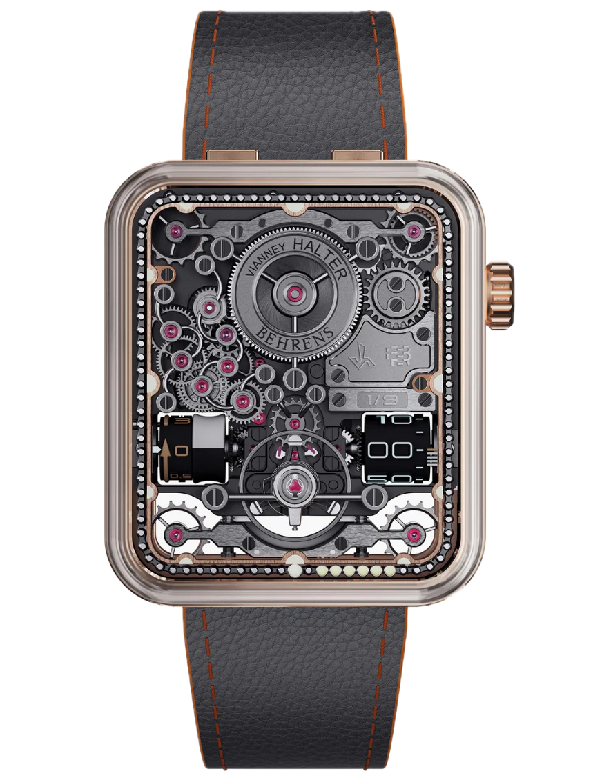 Fruit d’une collaboration exceptionnelle entre BEHRENS Original et le maître horloger indépendant Vianney Halter, la KWH Watch incarne l’union entre innovation technique et esthétique rétro-industrielle. Inspirée d’un ancien compteur électrique de l’atelier de Vianney Halter, elle associe le langage visuel singulier du maître suisse au savoir-faire mécanique audacieux de Behrens.