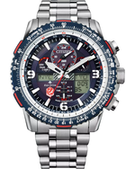 The Citizen Promaster Skyhawk A-T is a fully featured aviation watch designed for travelers and tech enthusiasts. With radio-controlled timekeeping (atomic timekeeping) for 43 cities, a 1/100-second chronograph, a perpetual calendar, dual time zones, alarms, and a countdown timer, it offers a comprehensive range of functions. Its Eco-Drive movement (powered by light) eliminates the need for battery replacement, and its robust case ensures water resistance to 200 meters.
