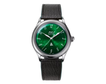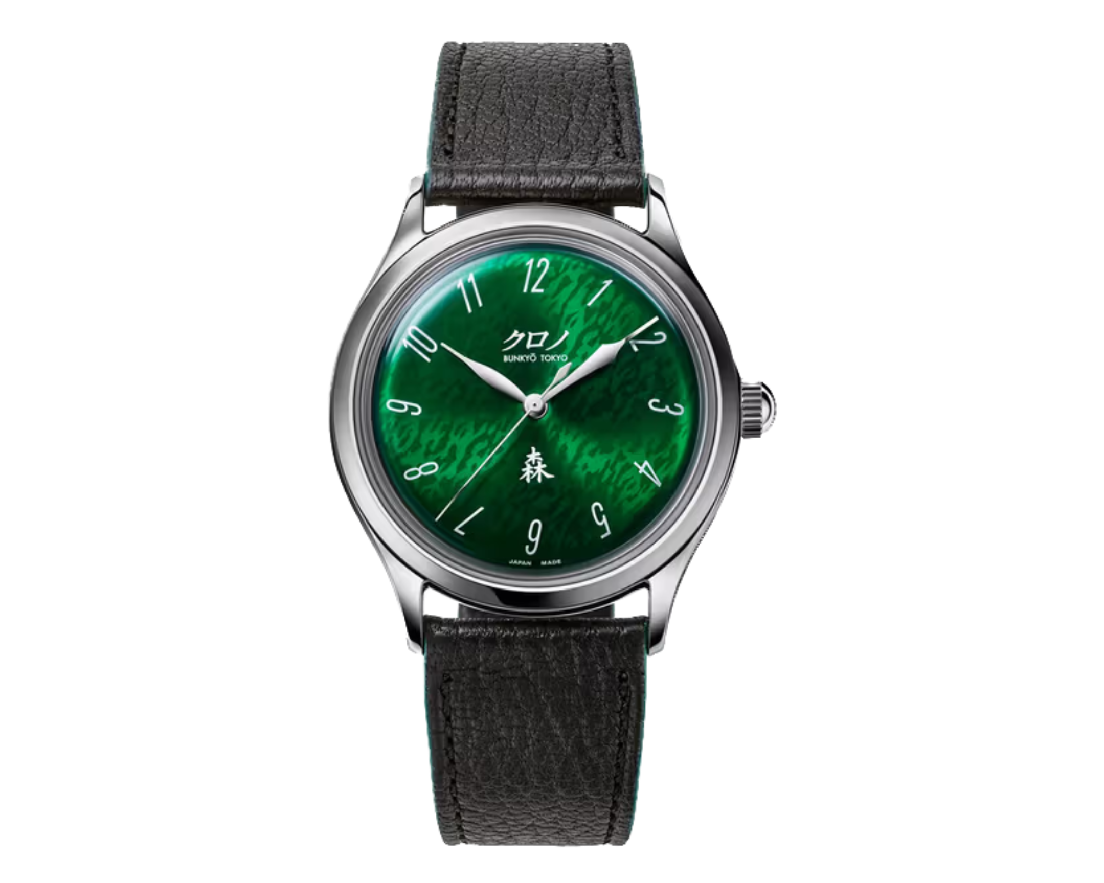 The Kurono Tokyo Anniversary Grand Mori is a limited-edition watch designed by master watchmaker Hajime Asaoka. Its sleek 37mm steel case houses a sumptuous green dial crafted from traditional urushi lacquer, hand-applied to a gold base. Inspired by light filtering through a canopy, the dial offers deep, changing reflections. Powered by a Miyota 90S5 automatic movement, it offers a 40-hour power reserve. Presented on a black leather strap with green stitching, the Grand Mori combines Japanese minimalism, exceptional craftsmanship, and effortless refinement.