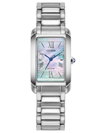 The Citizen L Bianca is a women's watch that combines elegance, refinement, and sustainable technology. With its 22mm curved rectangular case, mother-of-pearl dial, blue-tinted hands, and Art Deco-inspired design, it commands attention while remaining understated and elegant. Powered by Eco-Drive technology, it recharges with light, never needing a battery. Water-resistant to 50 meters, it's the perfect timepiece for chic and functional everyday wear.