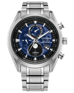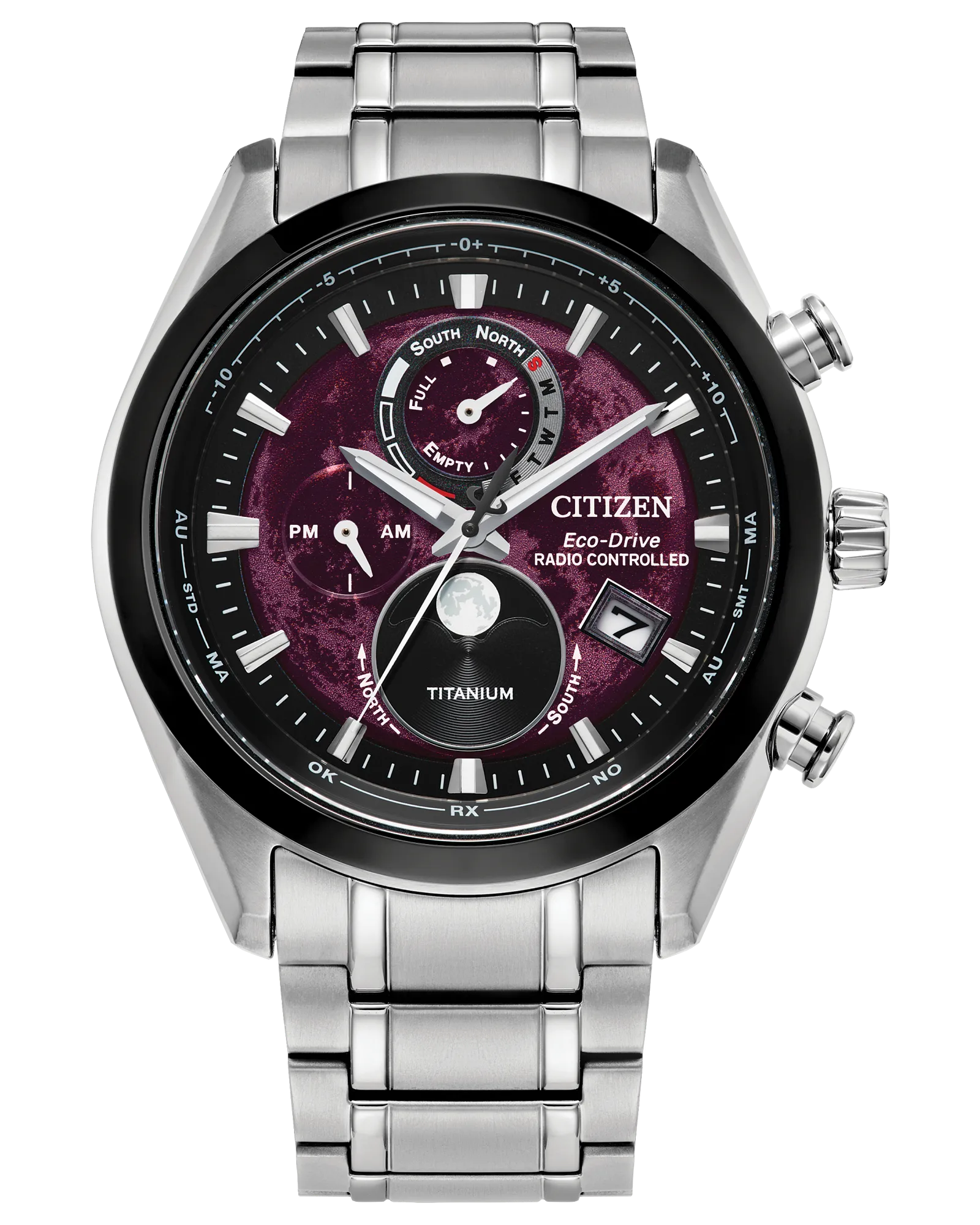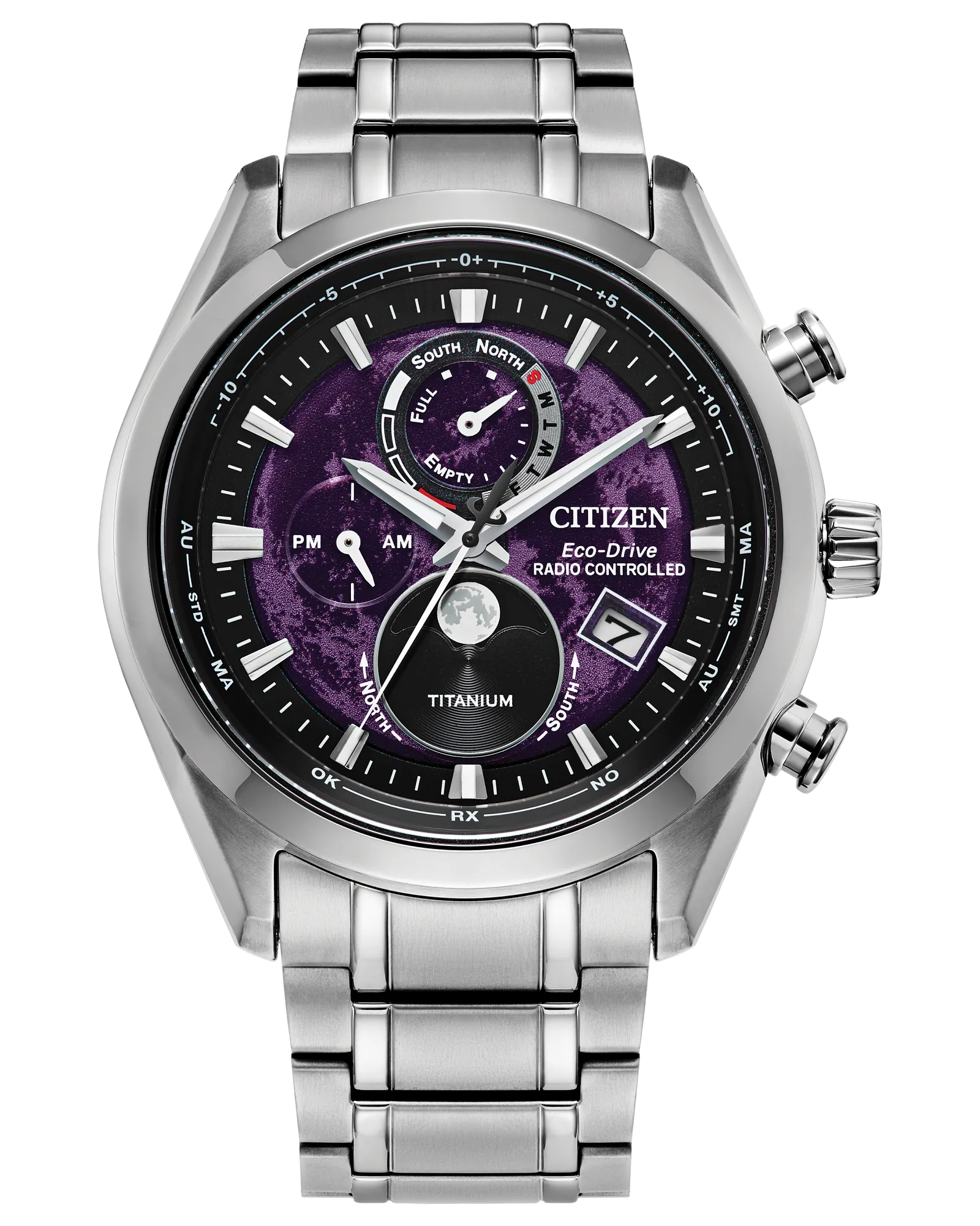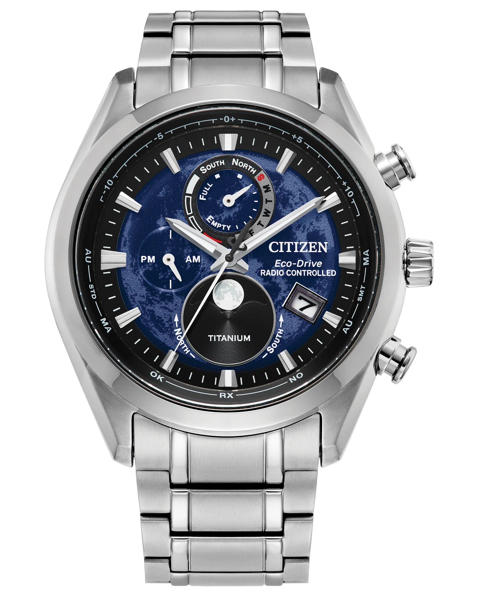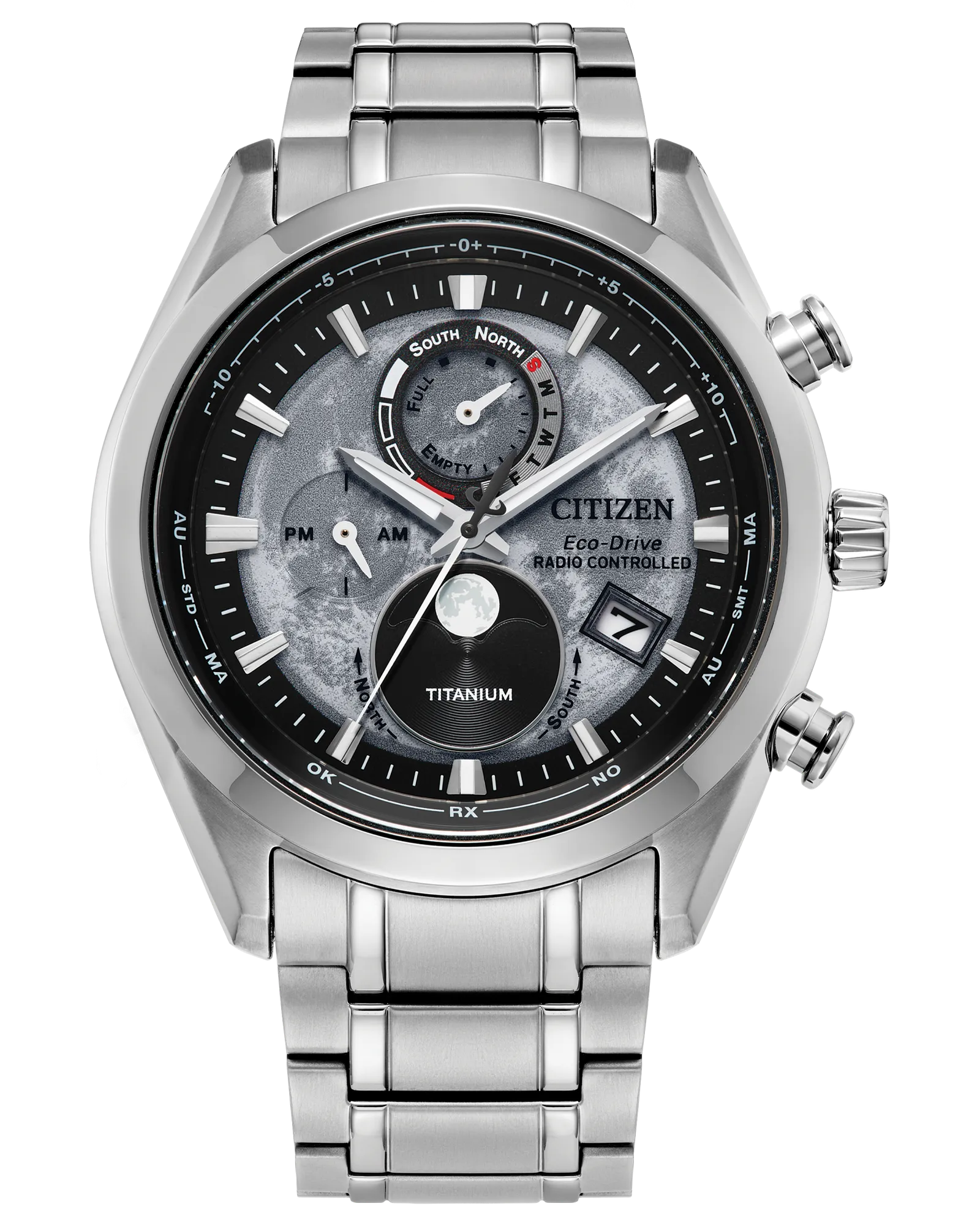 The Citizen Tsuki-yomi A-T is a flagship watch that combines cutting-edge technology with refined design. It is the first watch to combine moon phase and atomic radio synchronization—for extreme precision. It is crafted with a Super Titanium™ case, making it both lightweight and durable. The dial evokes the surface of the moon, and a window at 6 o'clock displays the moon phase in real time.