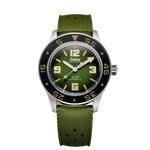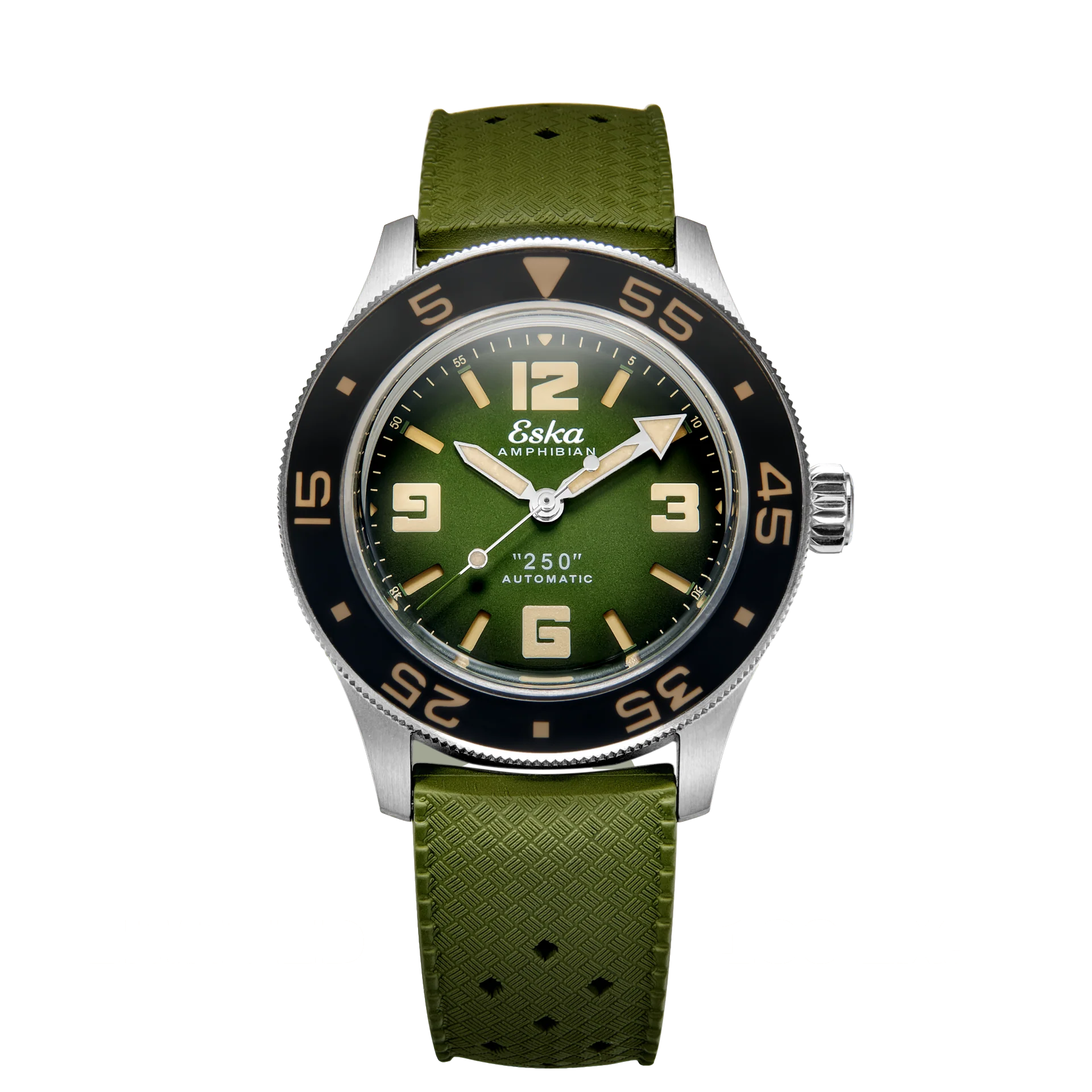 The Eska Amphibian 250-GT is a modern dive watch that borrows design elements from vintage dive watches. Powered by an automatic movement (such as the Sellita SW200 or equivalent), it is water-resistant to 250 meters, with a robust 40mm case and brushed/polished finishes. Its sandwich or oversized dial with cardinal hour markers, its unidirectional 120-click bezel, and its reinforced sapphire crystal with a retro profile give it a strong and instantly recognizable identity.