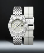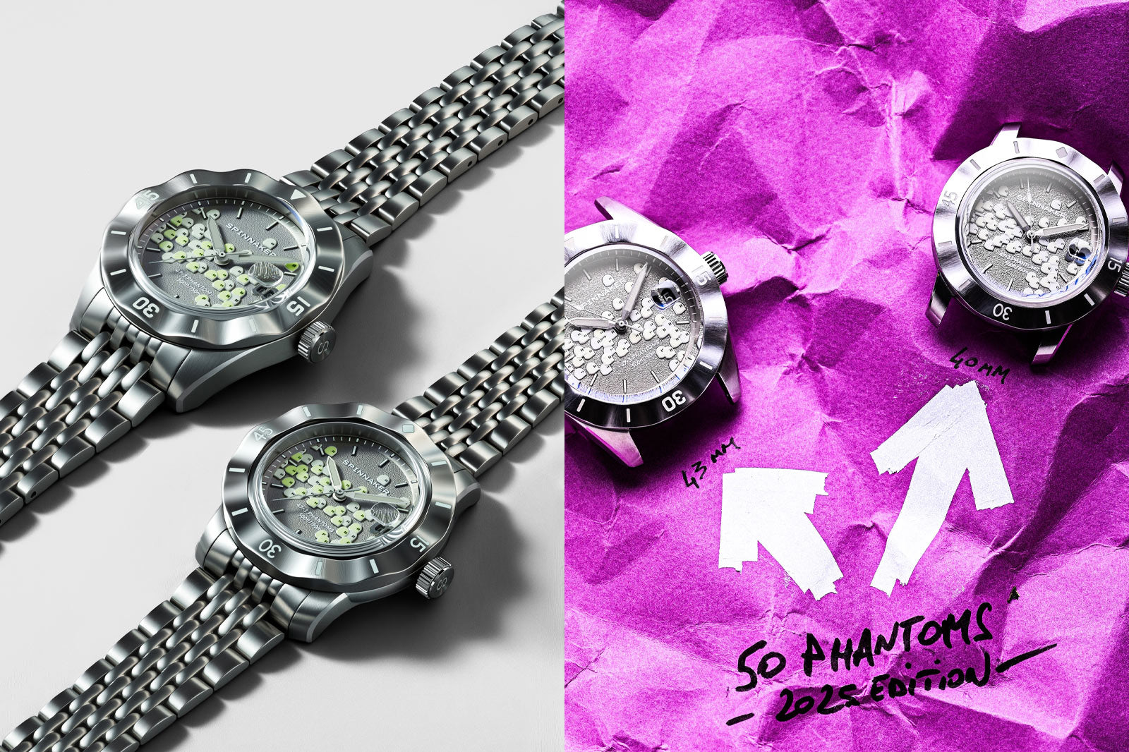 Case: 40 mm diameter x 12.5 mm thickness (Phantom Steel) or 43 mm diameter x 13.5 mm thickness (Phantom White), with sunburst brushed bezel and anti-reflective sapphire crystal