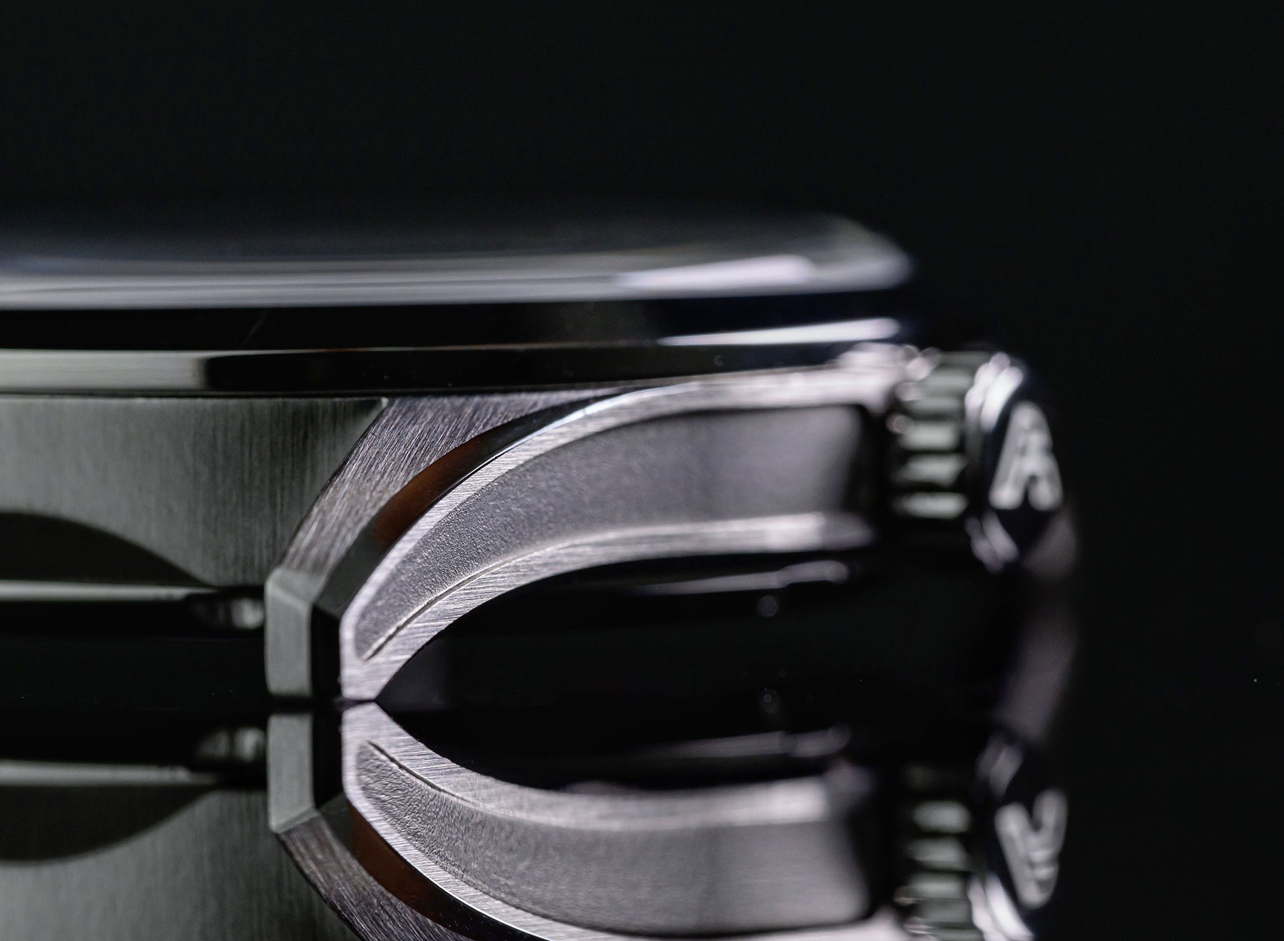 The 36mm stainless steel case features a highly polished bezel,  a vertically brushed finish  on the horns and  a sandblasted finish  on the CNC machined recessed central part.
