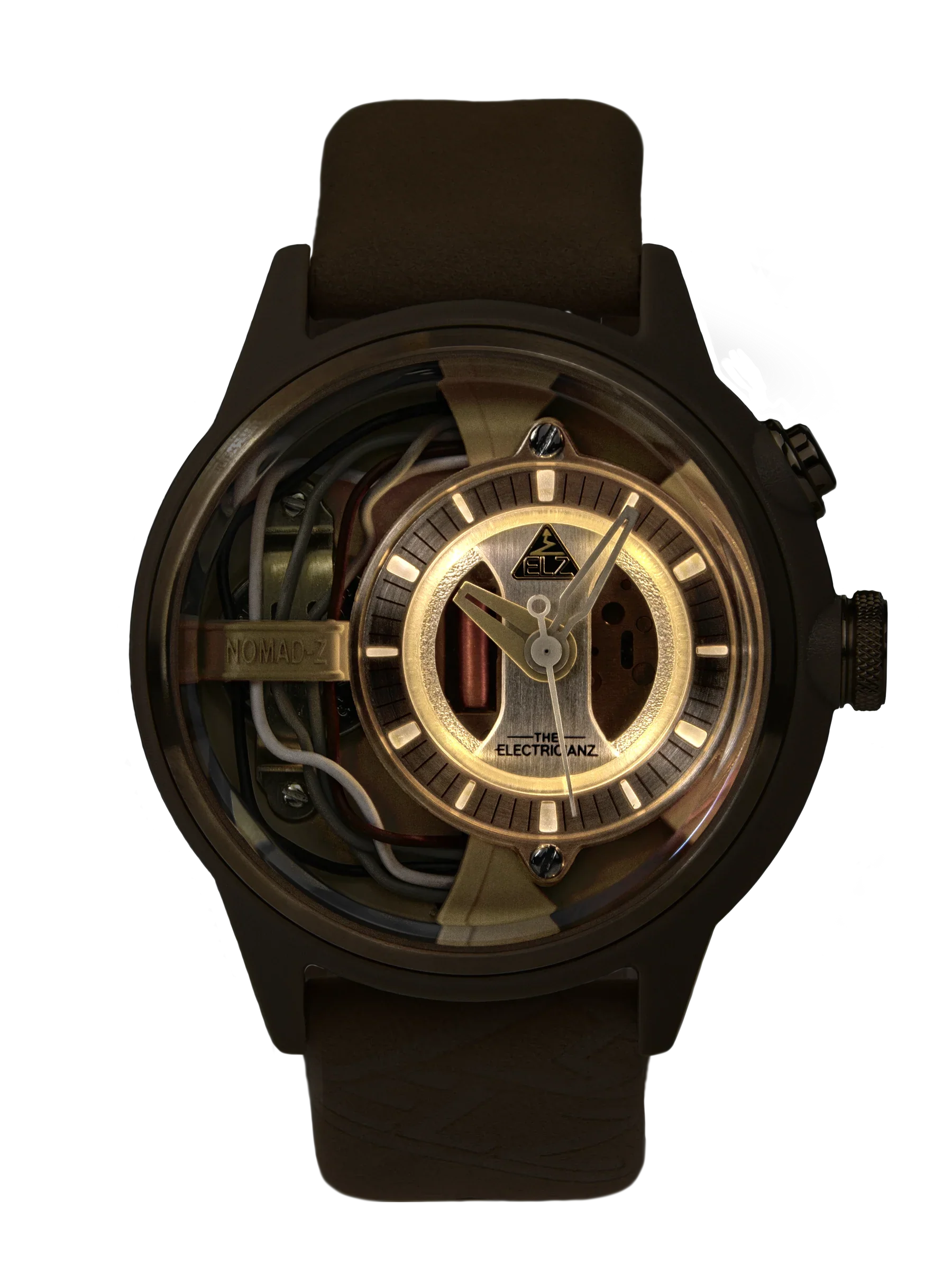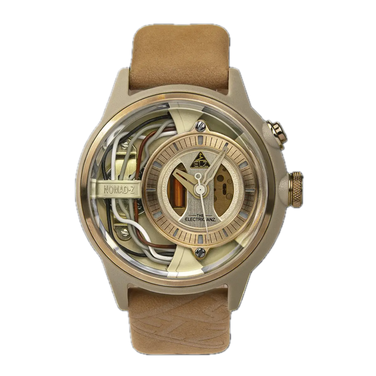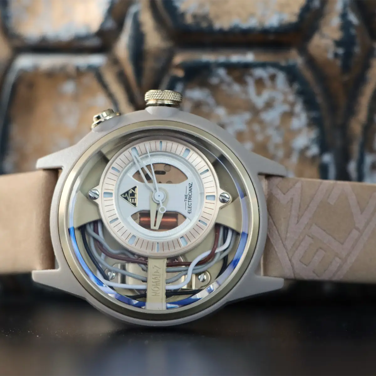 The Nomad-Z: Sumptuous velvety leather embraces the delicate case of the Nomad-Z. Spring colors elegantly enhance the volume of the watch. Spring colors elegantly enhance the volume of the watch, highlighting its depth and roundness. This is a true Electricianz and its true power is revealed at night. You have been warned!