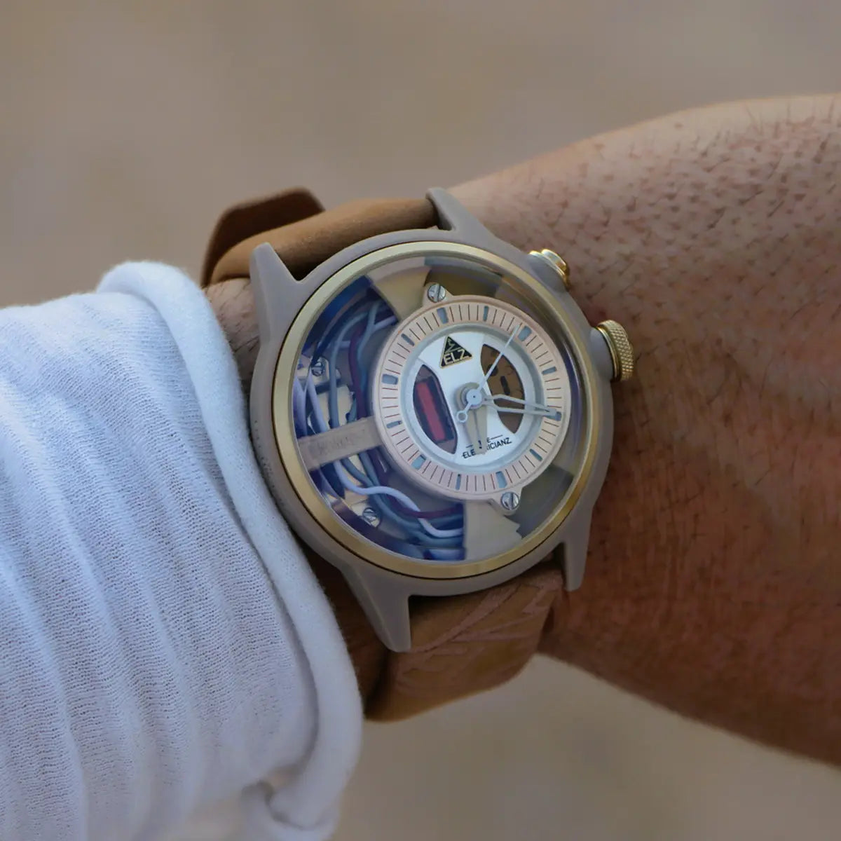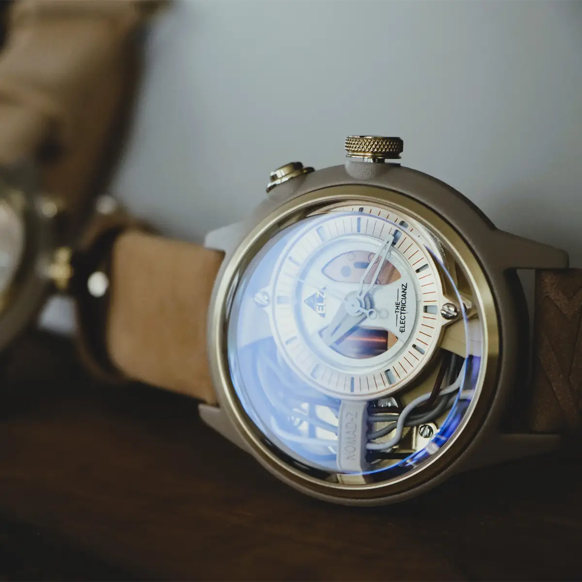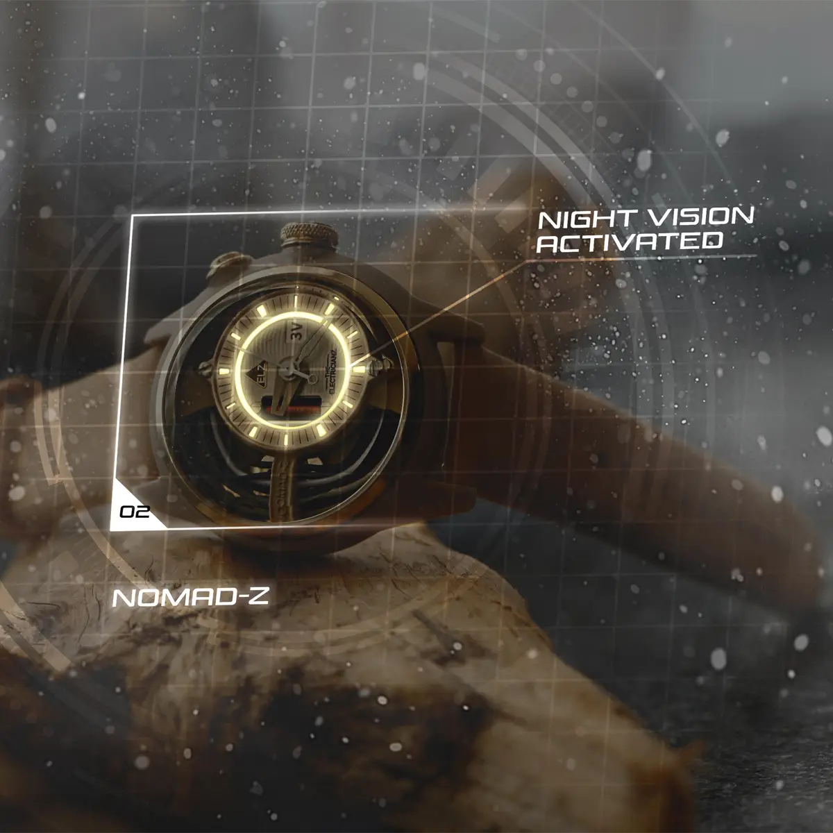 The Nomad-Z: Sumptuous velvety leather embraces the delicate case of the Nomad-Z. Spring colors elegantly enhance the volume of the watch. Spring colors elegantly enhance the volume of the watch, highlighting its depth and roundness. This is a true Electricianz and its true power is revealed at night. You have been warned!