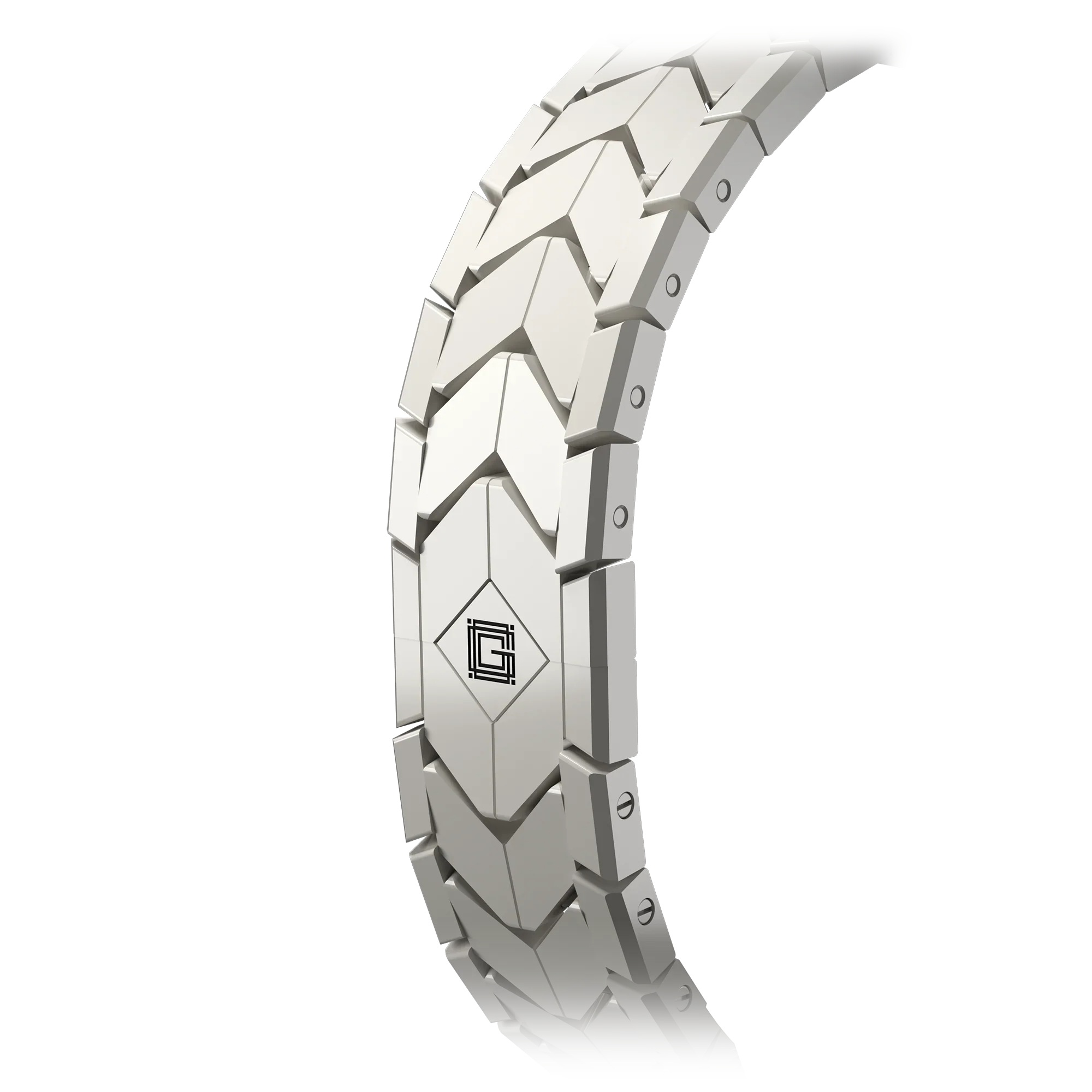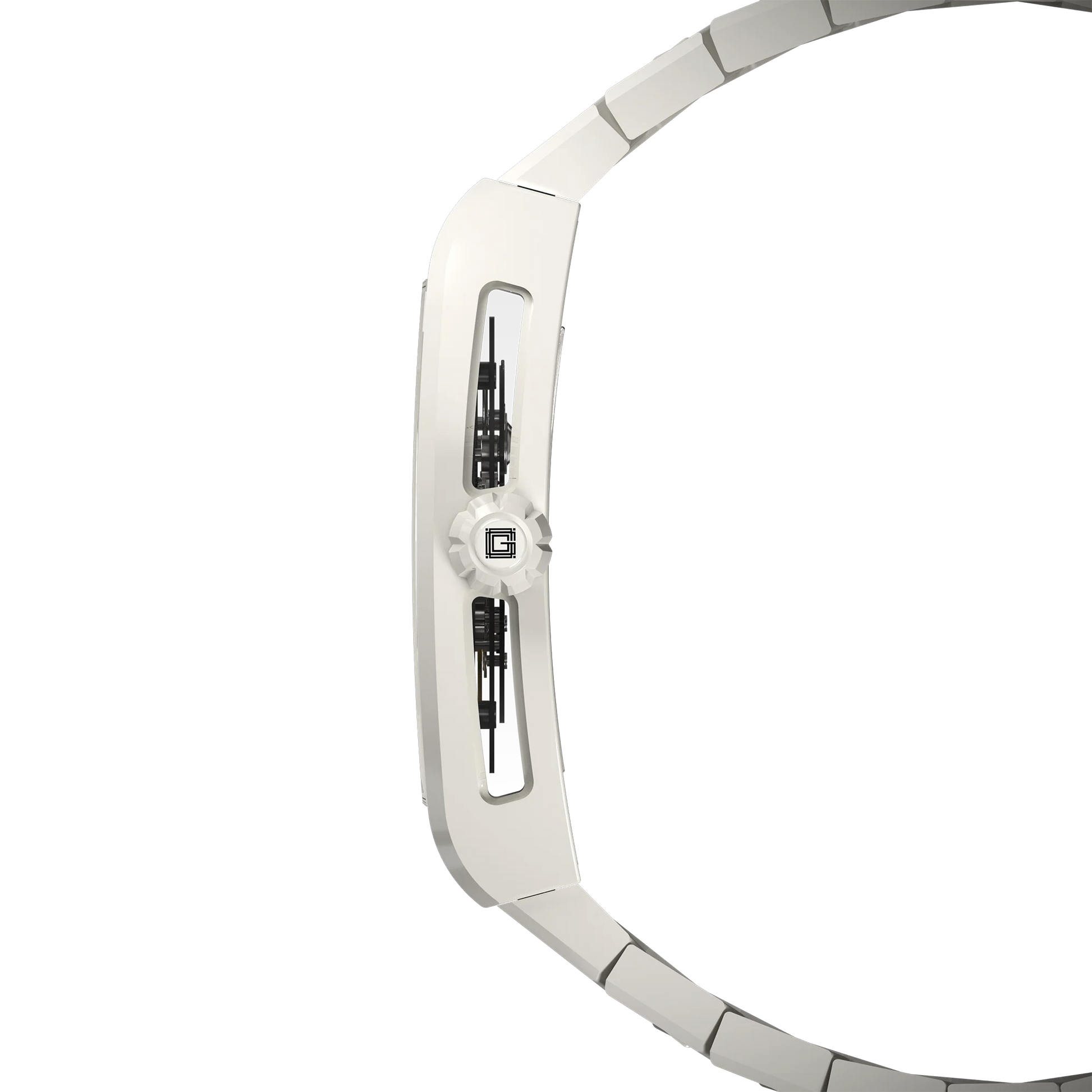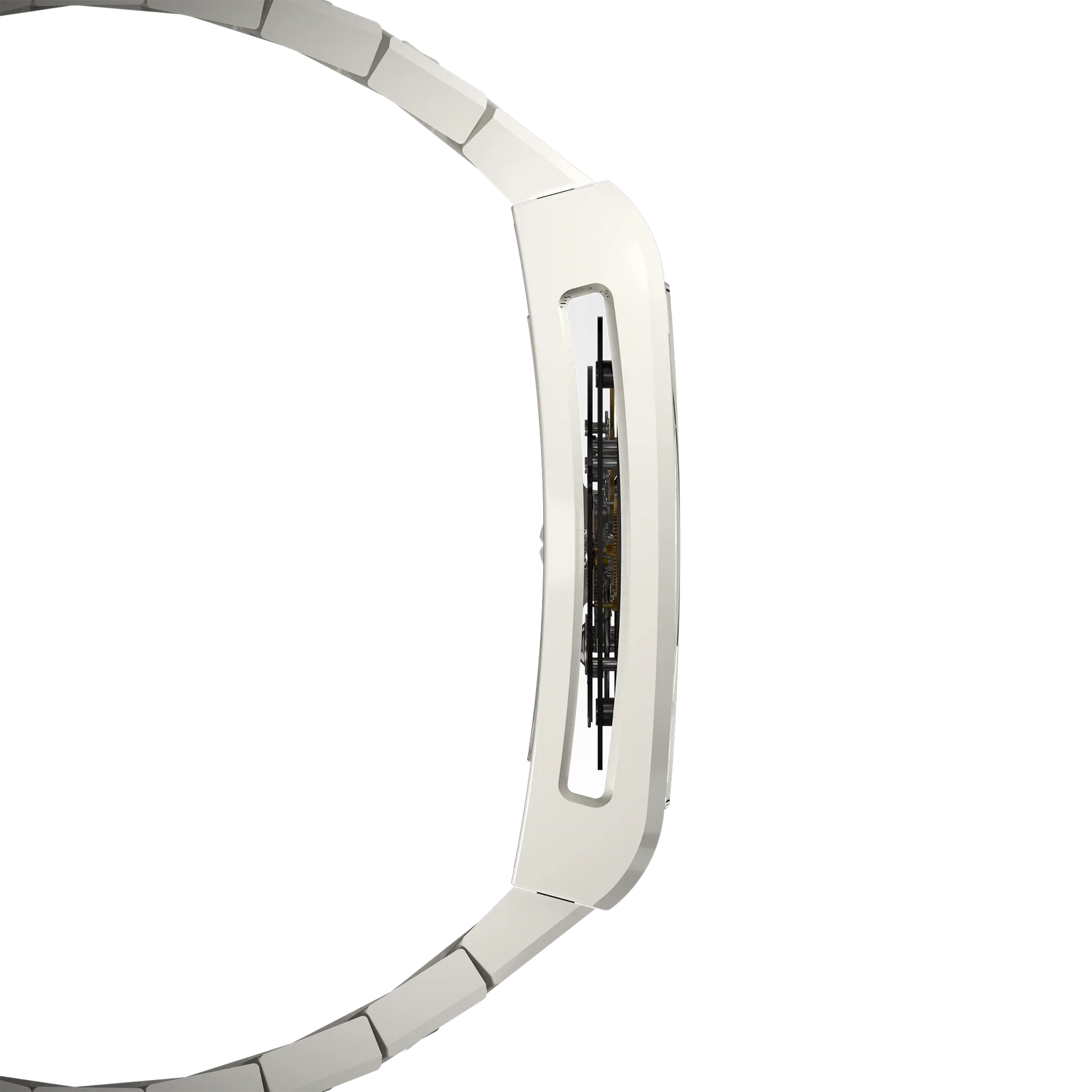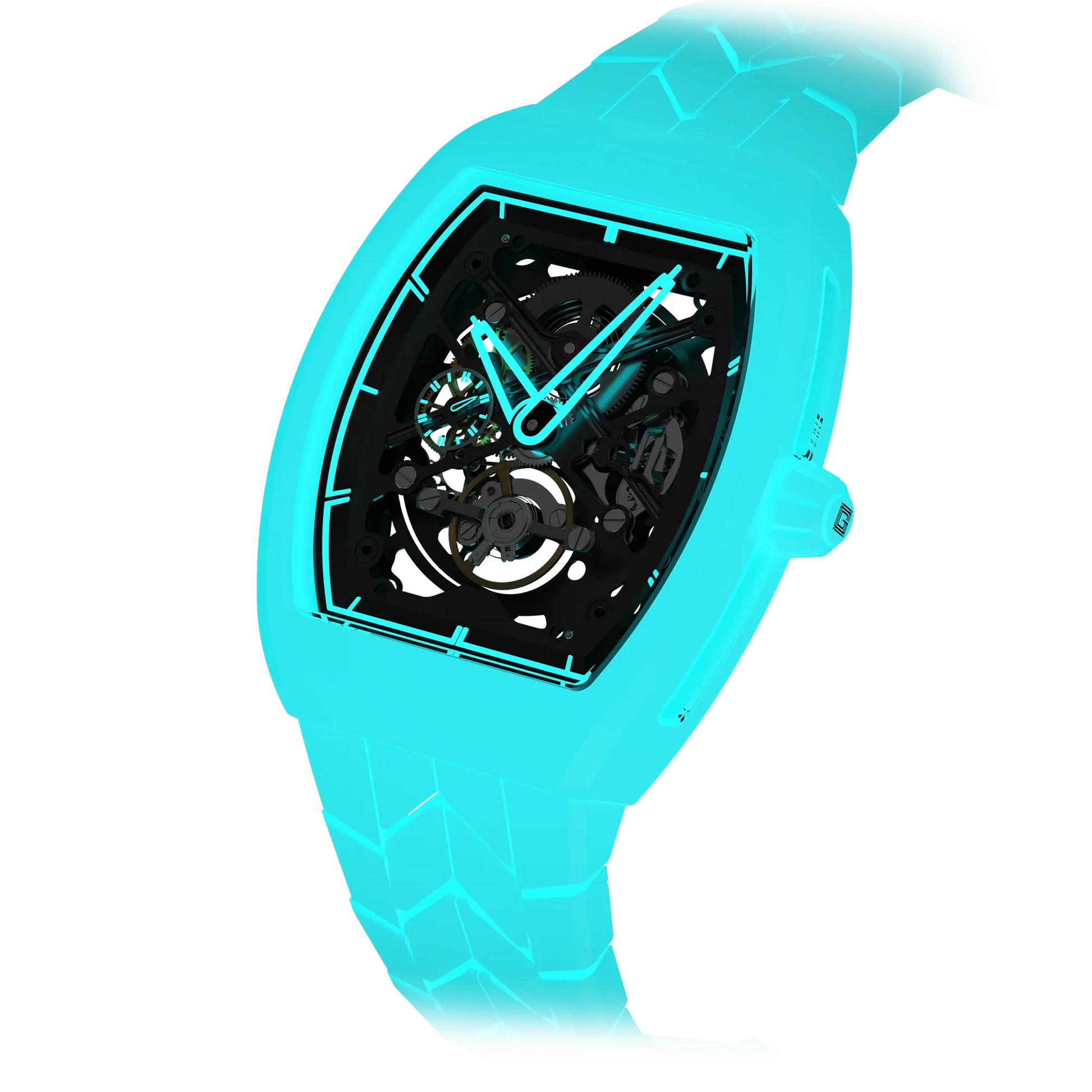 Notre céramique luminescente est d’un blanc éclatant le jour et se transforme en une lueur bleue envoûtante une fois la nuit tombée. Conçue à partir de composés céramiques infusés de Super-LumiNova de pointe, elle capte la lumière ambiante pour la restituer durant des heures dans une teinte douce et éthérée. Légère mais incroyablement résistante, elle défie les rayures et la décoloration tout en offrant une douceur tactile aussi raffinée que son apparence.