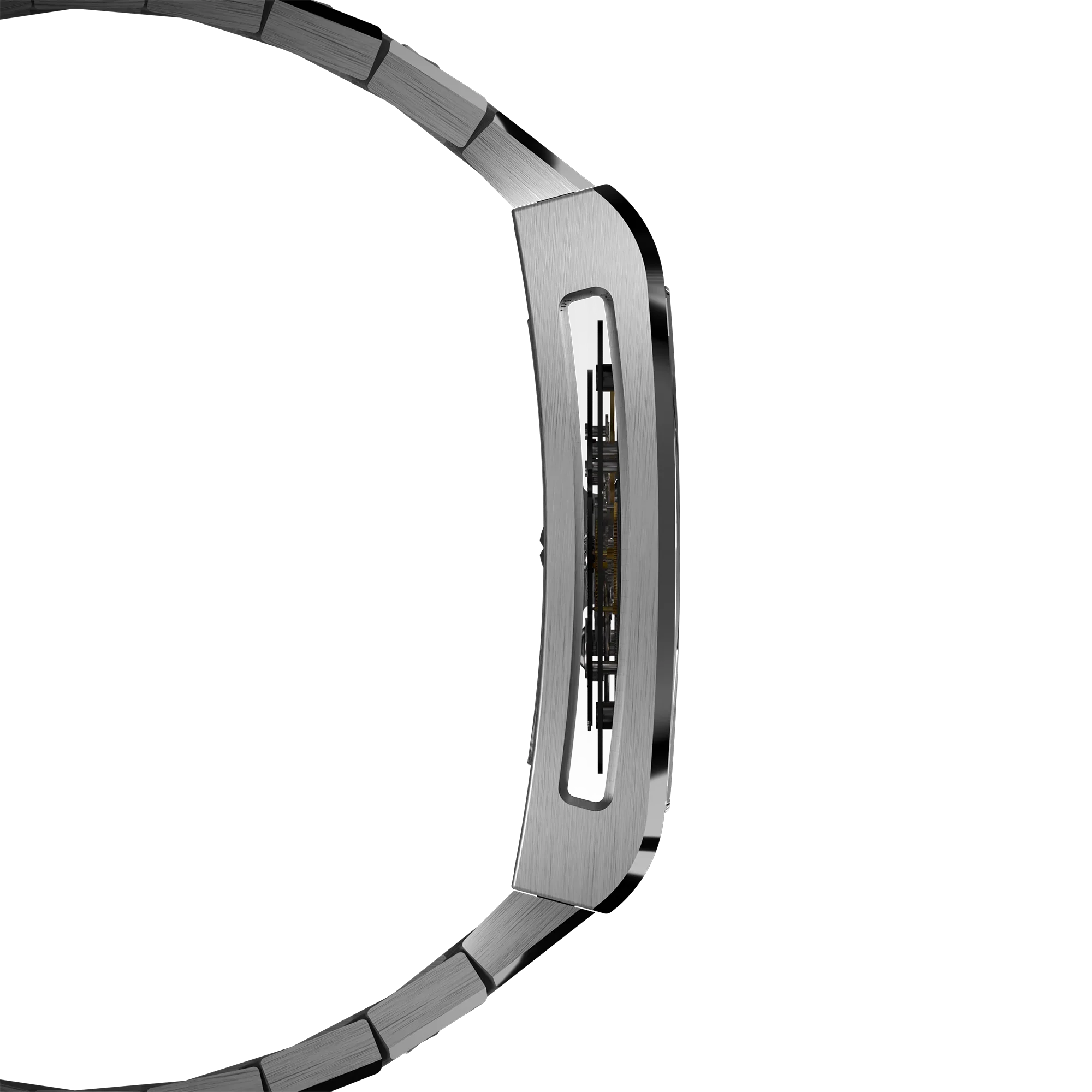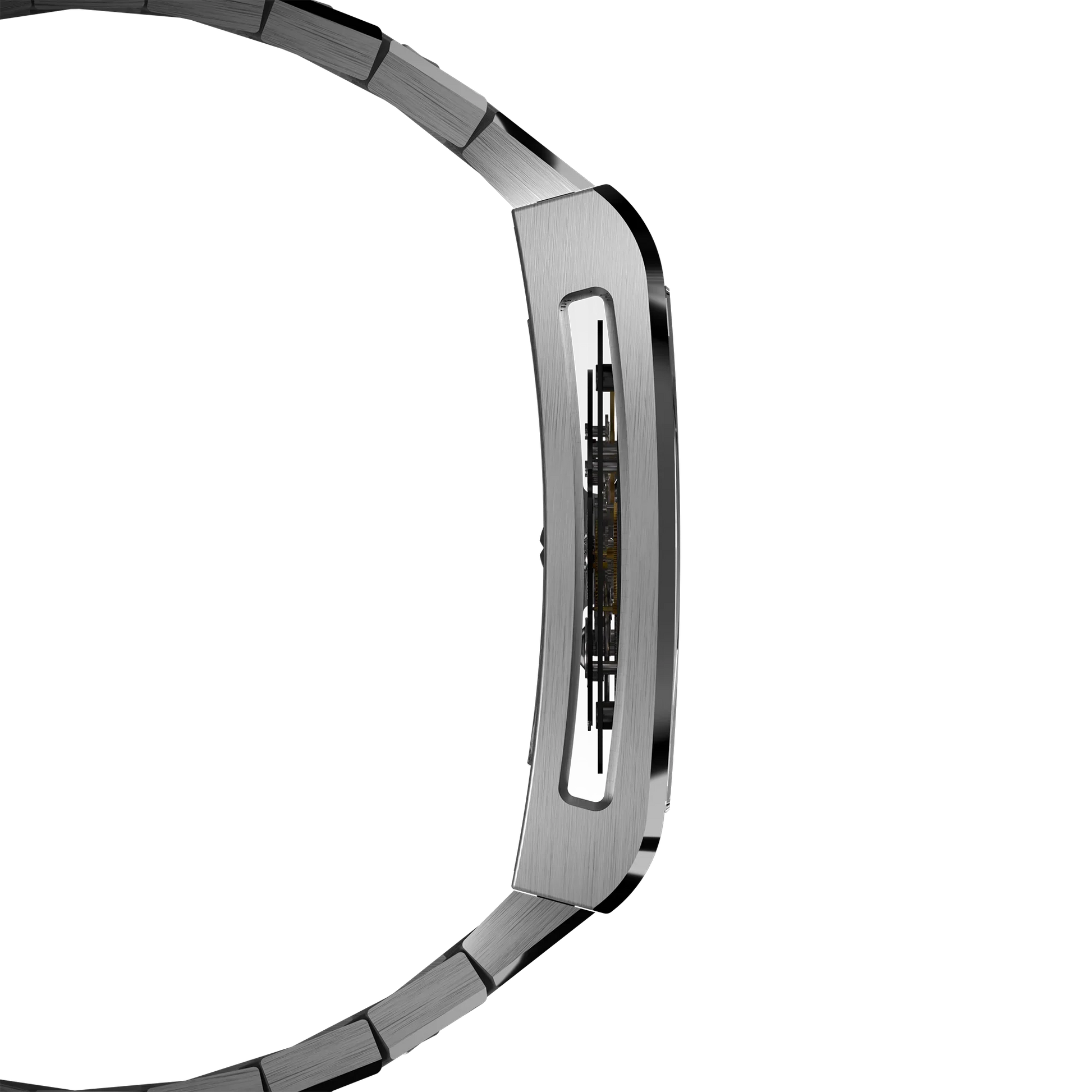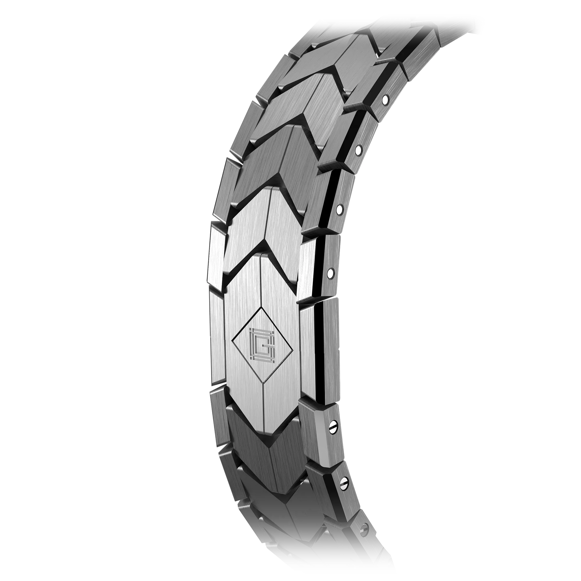 Le titane est le métal du gentleman moderne — élégant, résilient et d’une sophistication naturelle. Réputé pour être presque deux fois plus léger que l’acier inoxydable tout en étant aussi robuste, il procure une sensation de légèreté sans compromis sur la durabilité. Naturellement résistant à la corrosion, à la chaleur et au magnétisme, le titane est également hypoallergénique et biocompatible : aussi doux pour la peau qu’audacieux au poignet. La version brossée révèle une finition mate d’une élégance discrète.